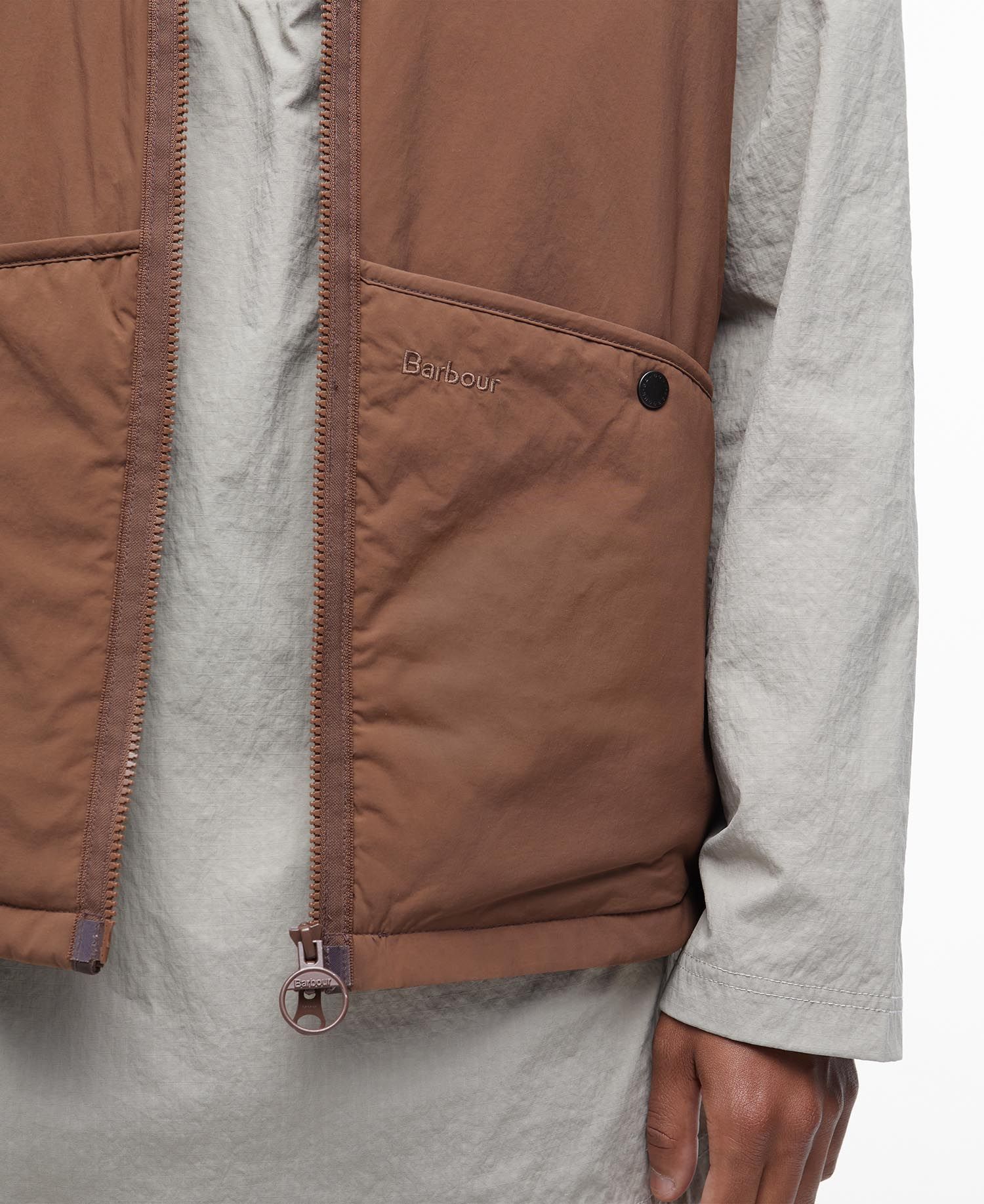 Barbour embroidery at left pocket.