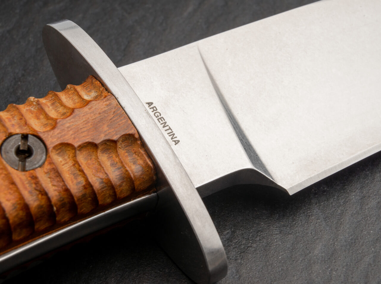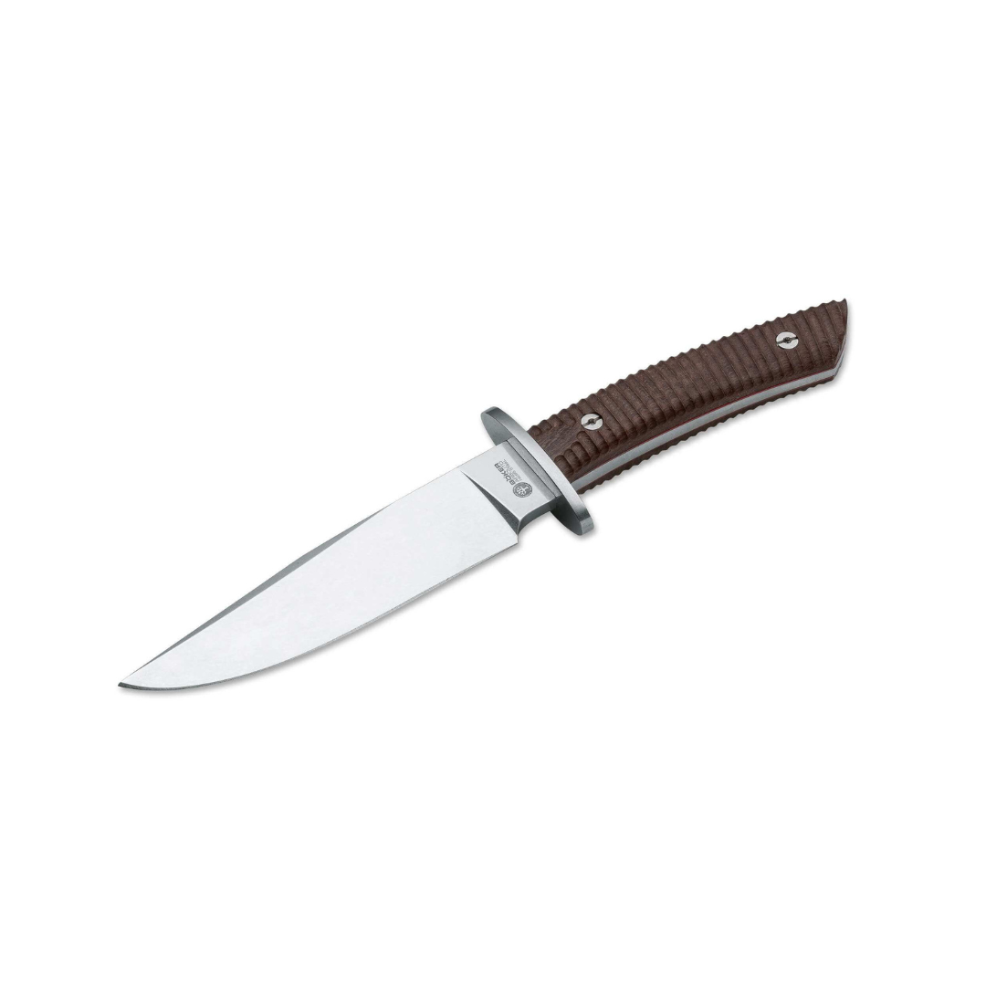 The solid construction in combination with the classic look and high utility value make the Boker Arbolito Esculta, the more compact version of the Boker El Gigante, an excellent companion for outdoor adventures and hunting. The Guayacan ebony scales are equipped with red fiber lines, giving an appealing contrast to the wood grain. The rough and grippy structure is reminiscent of the horns on an Oryx antelope. The ideal knife for outdoor and survival enthusiasts. Stonewash blade finish. The classic look of the material in combination with the extremely practical Stonewash blade finish make the Bowie an extraordinary knife not only for use but also for collectors. The solid Bohler N695 steel blade runs completely through the grip and tapers toward the pommel. This tapered tang gives the knife a particular visual appeal and provides outstanding balance. The protruding and stout hand guard is made from brushed stainless steel, promising high handling reliability and contributing to the refined appearance. Supplied with high-quality leather sheath.