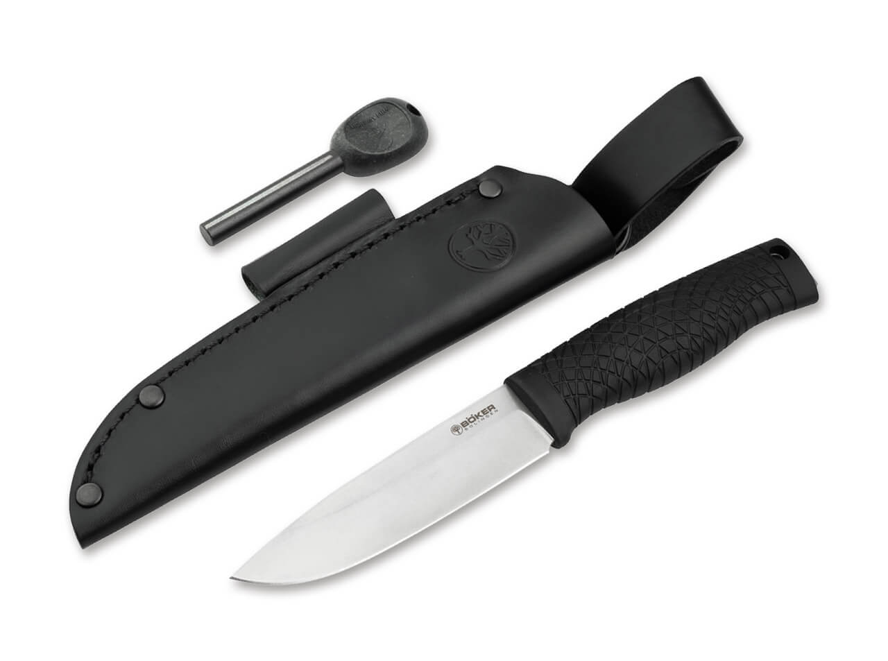 Boker was able to meet these ambitious requirements in the following way: The CPM-3V was developed by Crucible Industries LLC - the specialist and worldwide market leader in powder metallurgical steels - to provide unprecedented shock-load tolerance, breakage elasticity and splinter resistance with a phenomenal edge retention and hardness of 61±1 HRC. These properties of the powder-metallurgical carbon steel were achieved, among other things, by a precisely adjusted chromium content of 7.5%. In this way, the positive properties of the alloying element Cr, such as the increase in wear resistance and hardenability, could be utilised while maintaining a fine microstructure. The universal wide drop-point blade with a high-set saber grind has always been the hunter's preferred shape for both big and small game and is also suitable for both fine tasks such as stick feathering and for the more coarse, such as the obligatory batoning. The tang is continuous and protrudes a few millimetres from the end of the handle. This ensures maximum stability and the tang can also withstand powerful blows with a log or other object. A short part of the back of the blade forms sharp 90° edges on both sides for striking sparks from the included firestarter. TPE - thermoplastic elastomer - was chosen as the handle material, which completely encloses the tang and has a structure that provides a good grip in any loading direction. TPE is resistant, elastic, non-slip and has low heat conductivity. The knife therefore lies securely in the hand in all weather and working conditions and does not drain the strength from the fingers in wet and cold conditions. Compared to conventional elastomers, TPE also has the advantage of reducing the burden on the environment during production, as this is carried out purely physically and the lengthy and energy-consuming vulcanisation of chemically cross-linked elastomers is not necessary.