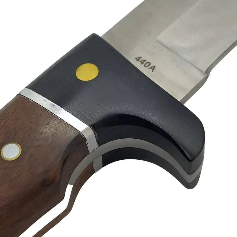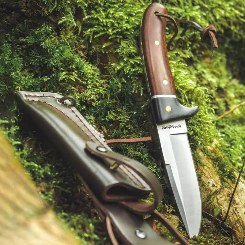 The Boker Magnum Elk Hunter impresses with its ideal blade length. Optics and function characterize the shapely knife with a stainless steel 440A blade. The sturdy full tang construction is supplied with ergonomically shaped handle scales in the following options: tropical Rosewood burl, which has a very smooth surface thanks to its fine pores in the processed state; the exotic Zebra wood, which immediately catches the eye with its elongated grain; and Ebony and Rosewood, and utterly elegant combination. The elongated ricasso on the back of the blade gives the knife a modern look. The lanyard hole allows a cord or a lanyard to be attached to the knife. All options come with a high quality leather sheath.