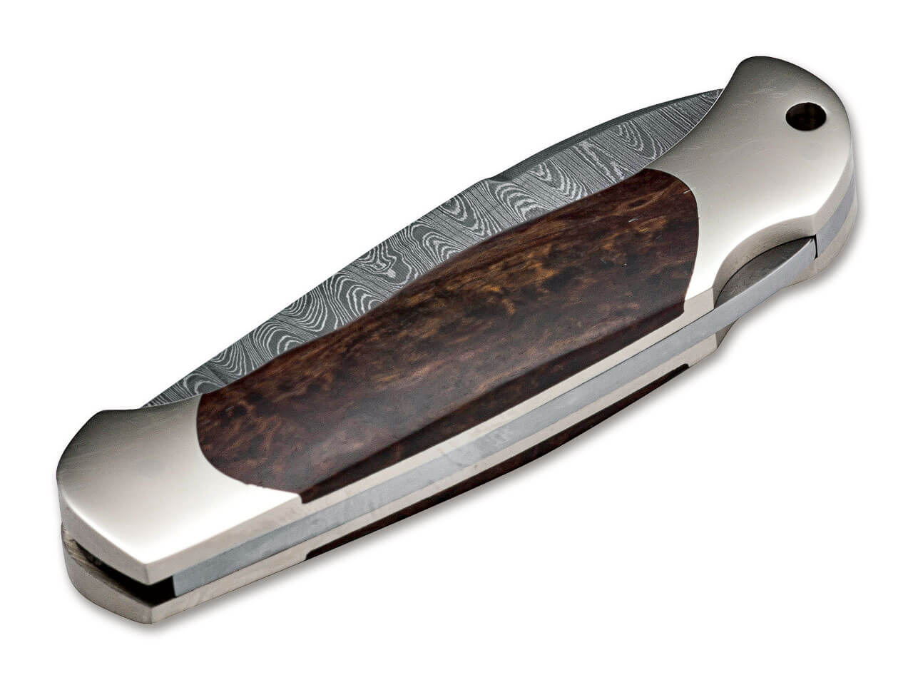 With its slim profile and seven-centimetre blade, it offers a little more hand strength than the Boy Scout, but is still much more comfortable to wear than the classic Scout. It is similar in design to its siblings and has a CNC-milled nickel silver body. The completely redesigned Spearpoint blade with an elegant ricasso on the back of the blade gives the Junior Scout a more modern and dynamic appearance without being obtrusive or even aggressive. It is made of hand-forged damascus by Chad Nichols from the USA and is locked by a stable backlock. The stainless damask in the Coibelt pattern is ice-hardened to 59 HRC. This makes the Junior Scout a handy but sturdy everyday knife that combines classic, elegance and utility in an almost inimitable way. With lanyard hole and noble scales made of stabilised Scandinavian burl birchwood or dark scales made of stabilised ironwood. Handmade in the Boker knife manufactory Solingen. Delivery with individual serial number and certificate of authenticity.