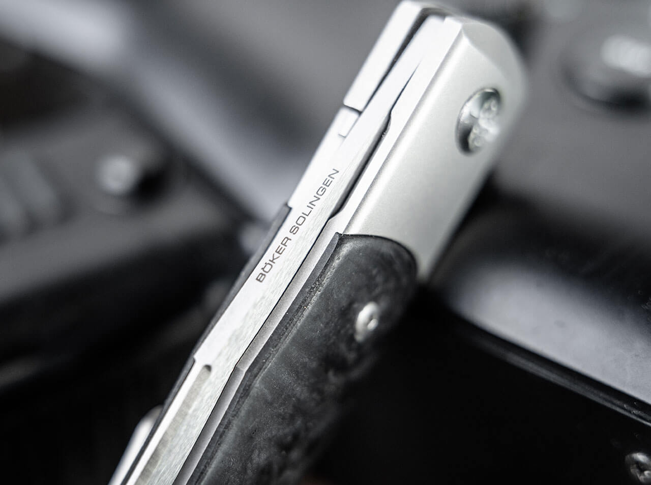 The long bolster of the titanium handle reinterprets the nostalgic spirit of the times and shapes the TRPPR with its handle scales made of stabilised black Amboina Wood with its unique grain into a new model of contemporary knife culture. Decorative accents are set by the front blade axle screw, which features the famous Boker tree mark, and the titanium clip (tip-up/r) milled from the solid with a ball. To protect it from dirt and scratches, the Boker TRPPR comes in a high-quality felt pouch. Handmade in the Boker Manufactory in Solingen.