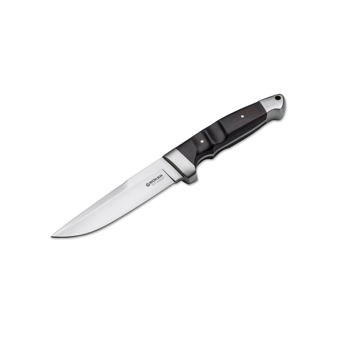The big brother of the ageless trusty Vollintegral, or Full-Tang, addresses the frequently expressed desire for a larger version. With a blade length of approx. 14.7 cm, the Vollintegral is also appropriate for bigger game, from Northern Europe to overseas. The Vollintegral XL gets the same model maintenance features as the smaller Vollintegral. The handle was given a more crowned shape, while the parrying element and pommel are rounded to optimize visual appeal and handling. Moreover, the Vollintegral XL now also has the finger grooves of the more compact model to achieve the best possible ergonomics. The blade on the XL was also converted to a flat grind to maximize blade strength. Die-forged from a single 440C blank. Comes with leather sheath. With scales made from premium certified imported grenadilla wood.