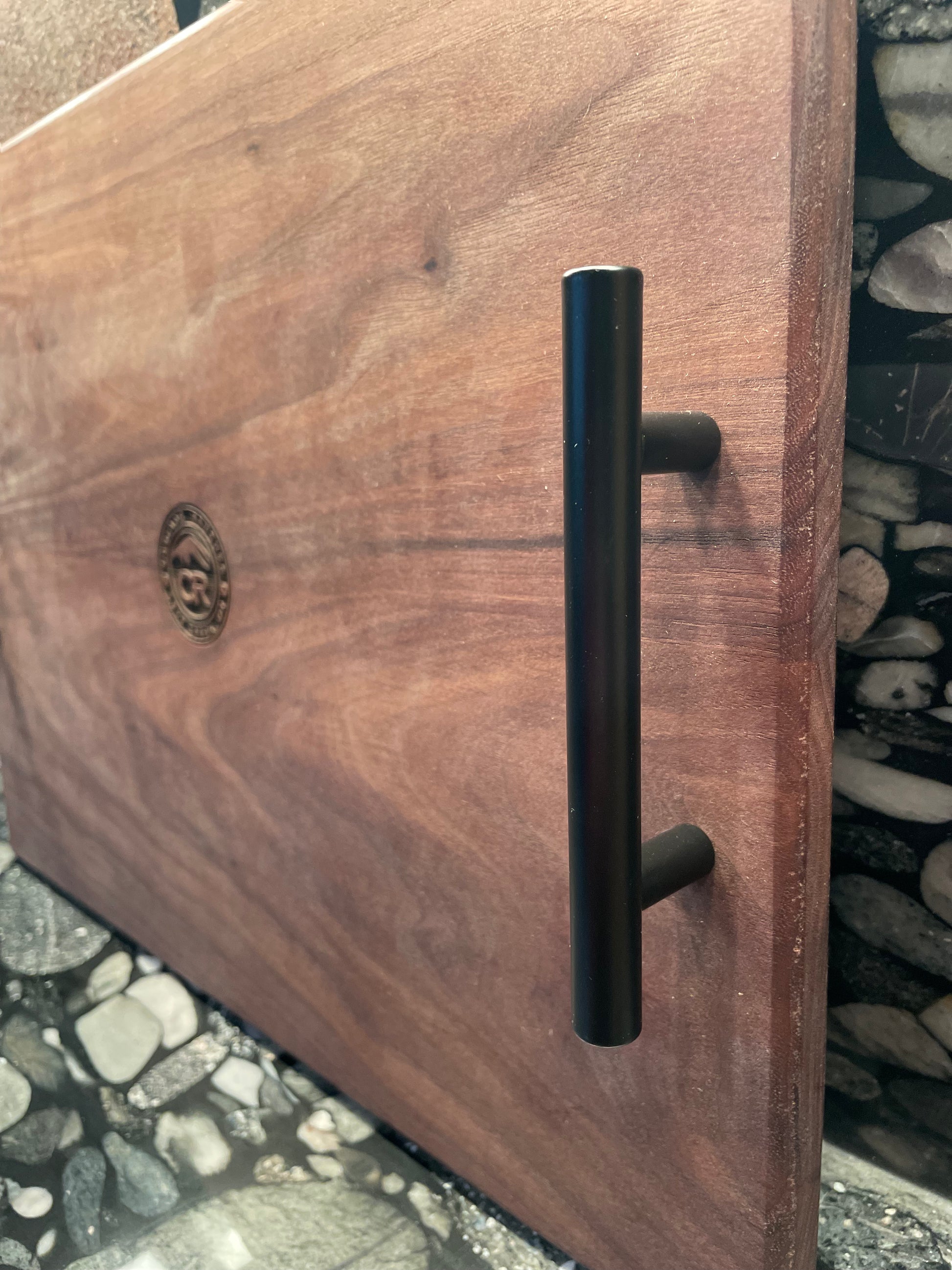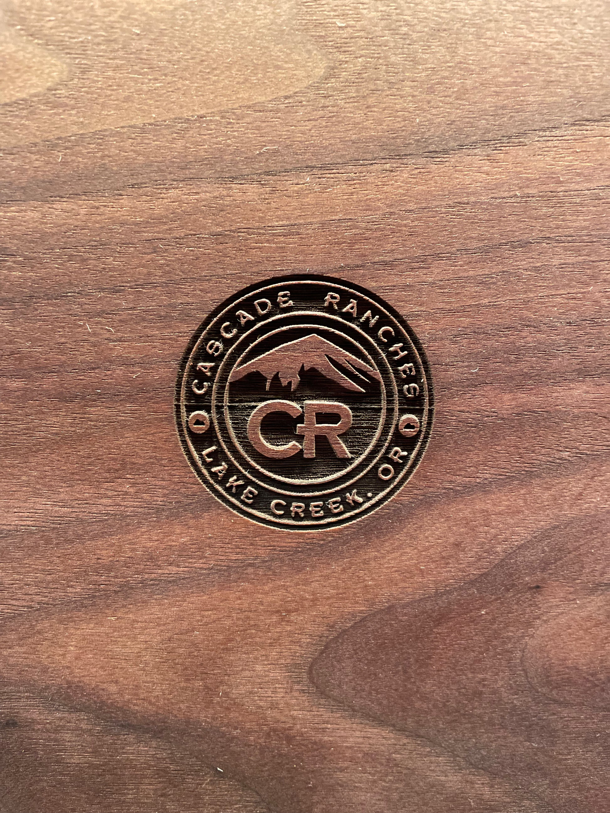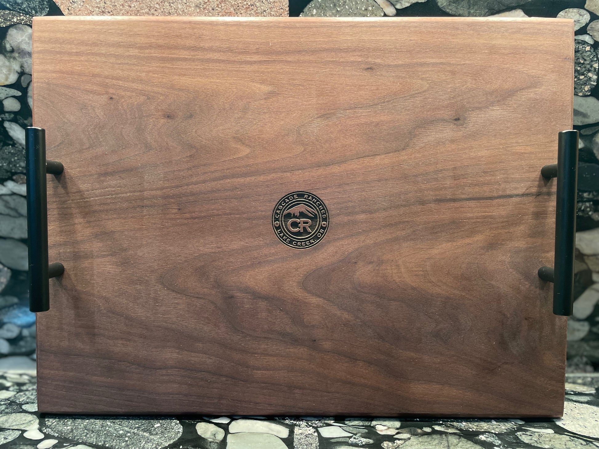 This charcuterie board is the perfect addition to your next gathering. It is handmade of walnut with unique coloring and comes with black handles for easy maneuvering. Cascade Ranches logo engraved into the board for a chic touch.