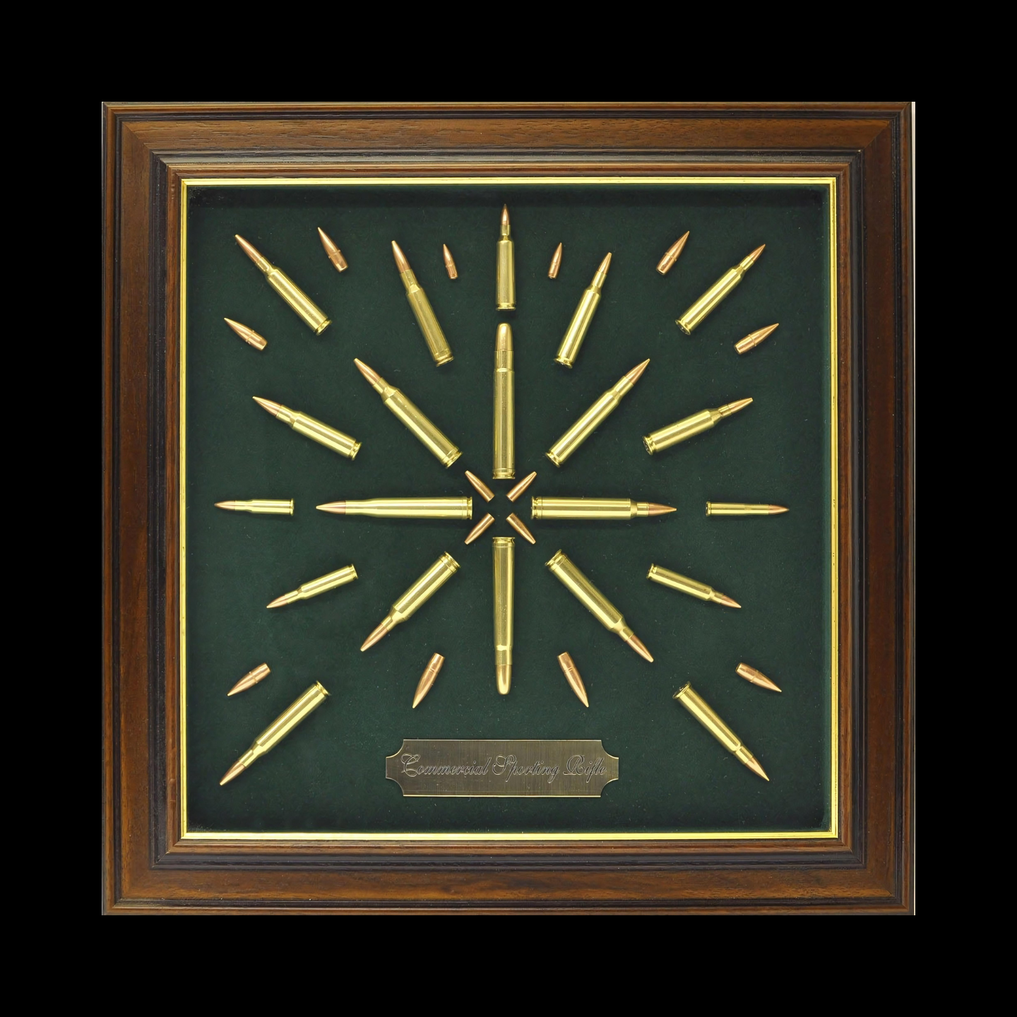 These beautiful pieces feature a decorative wood and glass frame, green wool felt background, and clear descriptions. They can be displayed separately or combined to create an informative display of these iconic cartridges. Custom made by The Sporting Gentry, leader in Sporting design.