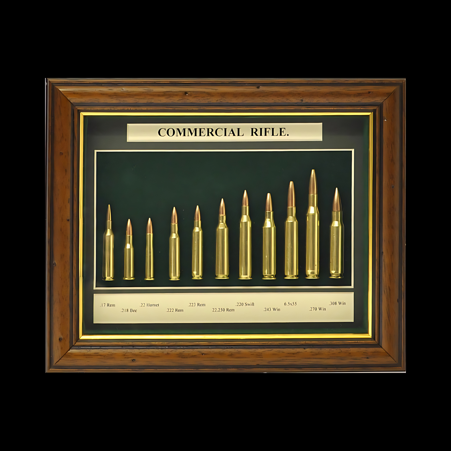 These beautiful Cartridge Boards feature a decorative wood and glass frame, green wool felt background, and clear descriptions. They can be displayed separately or combined to create an informative display of these iconic cartridges. Custom made by The Sporting Gentry, leader in Sporting design.