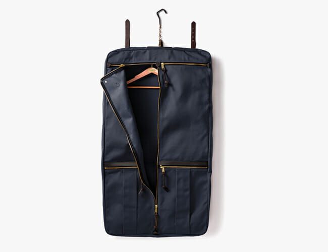 These garment bags will protect your suits in transit and can also take your dress shoes along for the ride, thanks to the gusseted pockets. They come equipped with an interior hanger clasp and can fit three suits comfortably. Paraffin-treated for maximum water repellency, with bridle leather straps, a full-width exterior pocket, and heavy-duty brass zippers