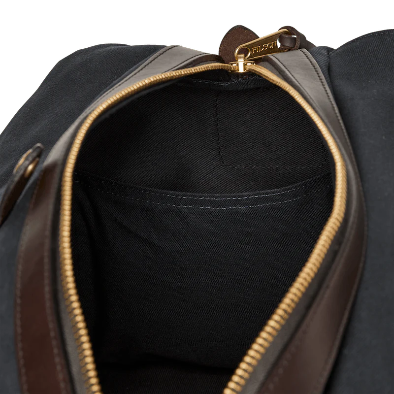 Rather than waxed canvas, Rugged Twill was chosen for its exceptional abrasion resistance. This industrial-strength fabric comes from Britain’s oldest, most storied mills, and is lightly waxed to keep valuables dry and protected from the elements. The Bridle Leather for the handles is strong and durable enough for horse tack, and wraps completely around the bag to cradle the heaviest loads. It’s been slowly vegetable-tanned over several weeks in natural plant-based solutions that transform top-grade cowhides into sturdy, supple, and lustrous leather that molds to the shape of your hand and shoulder over decades of use. The rustproof heavy-gauge zipper is built from solid brass and is reinforced with more of our saddle-grade leather. Sand-cast brass hardware is debossed custom for Filson.