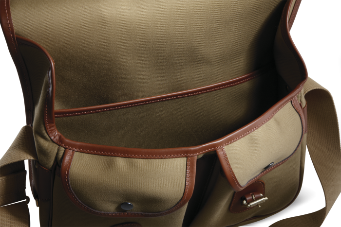 Compact Do-It-All: Croot's biggest carryall with a large main compartment, full-width rear pocket and two large, gusseted pockets on the front with flap closure. The cotton webbing shoulder strap is fully adjustable and a comfortable 2" wide. Access is by using either the solid brass buckles or the quick-release brass studs.