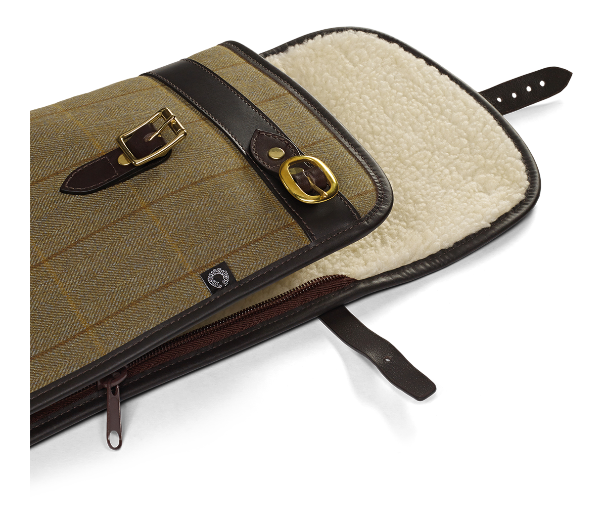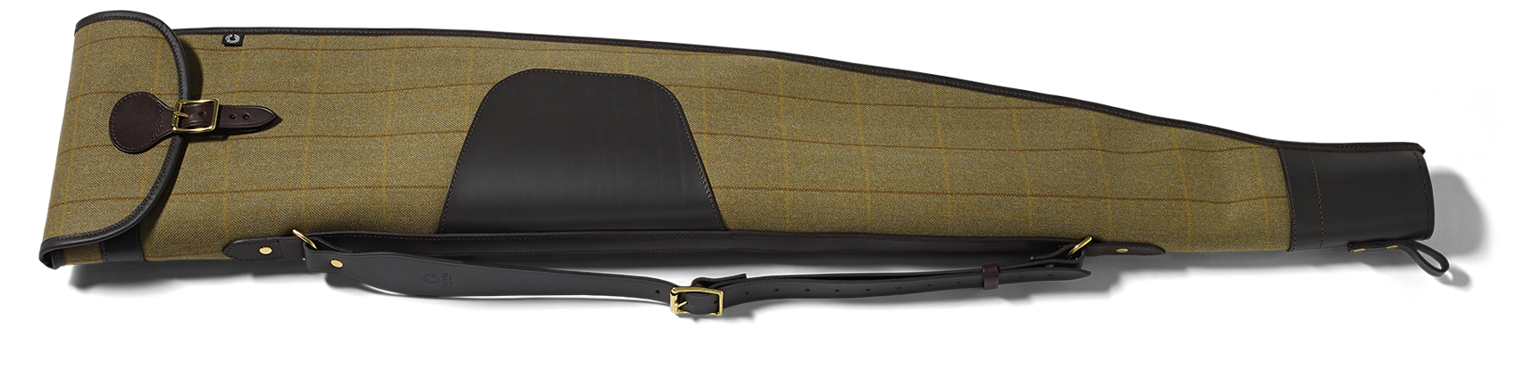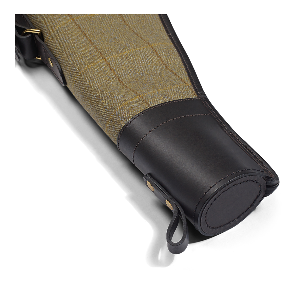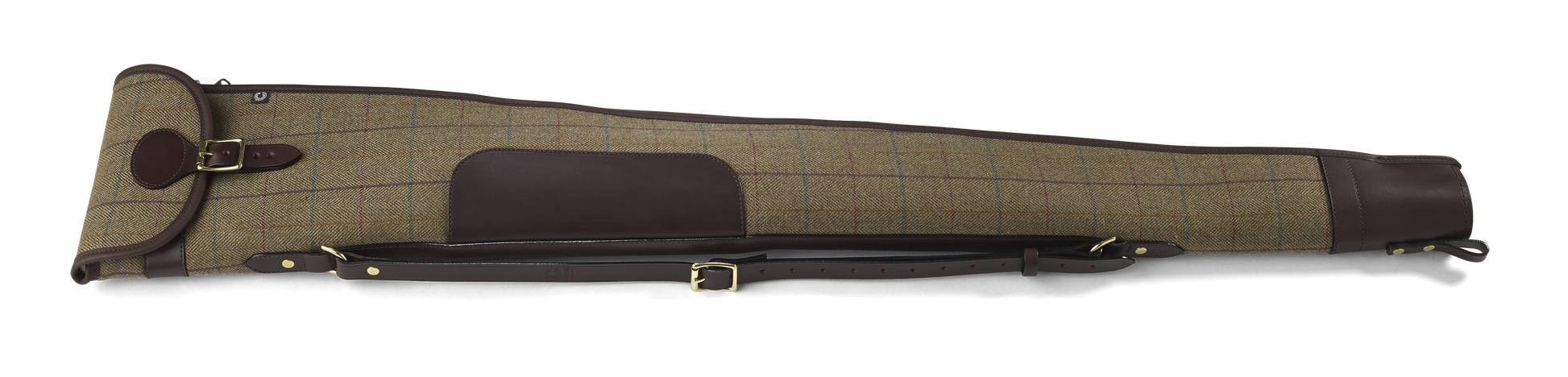 Transport and carry shotguns with traditional style and reliability. The Helmsley Tweed shotgun slip from Croots has a traditional flap and buckle opening, plus a full-length zip allowing easy drying. Bridle leather shoulder sling, hand-sewn blocked muzzle end, and a padded fleece lining come as standard features in this exquisite hand-made shotgun slip. Made from 100% wool with a rubber membrane as waterproofing.