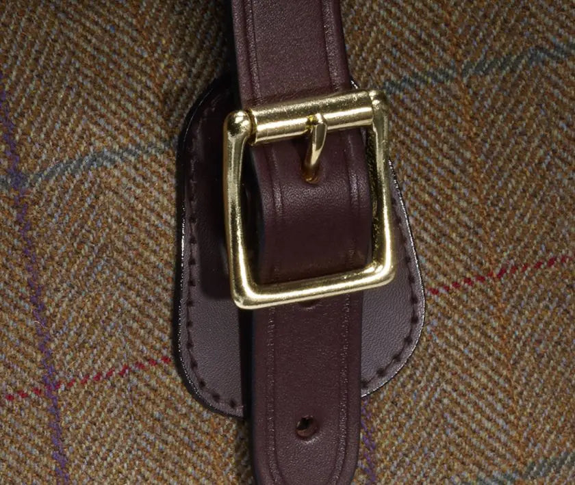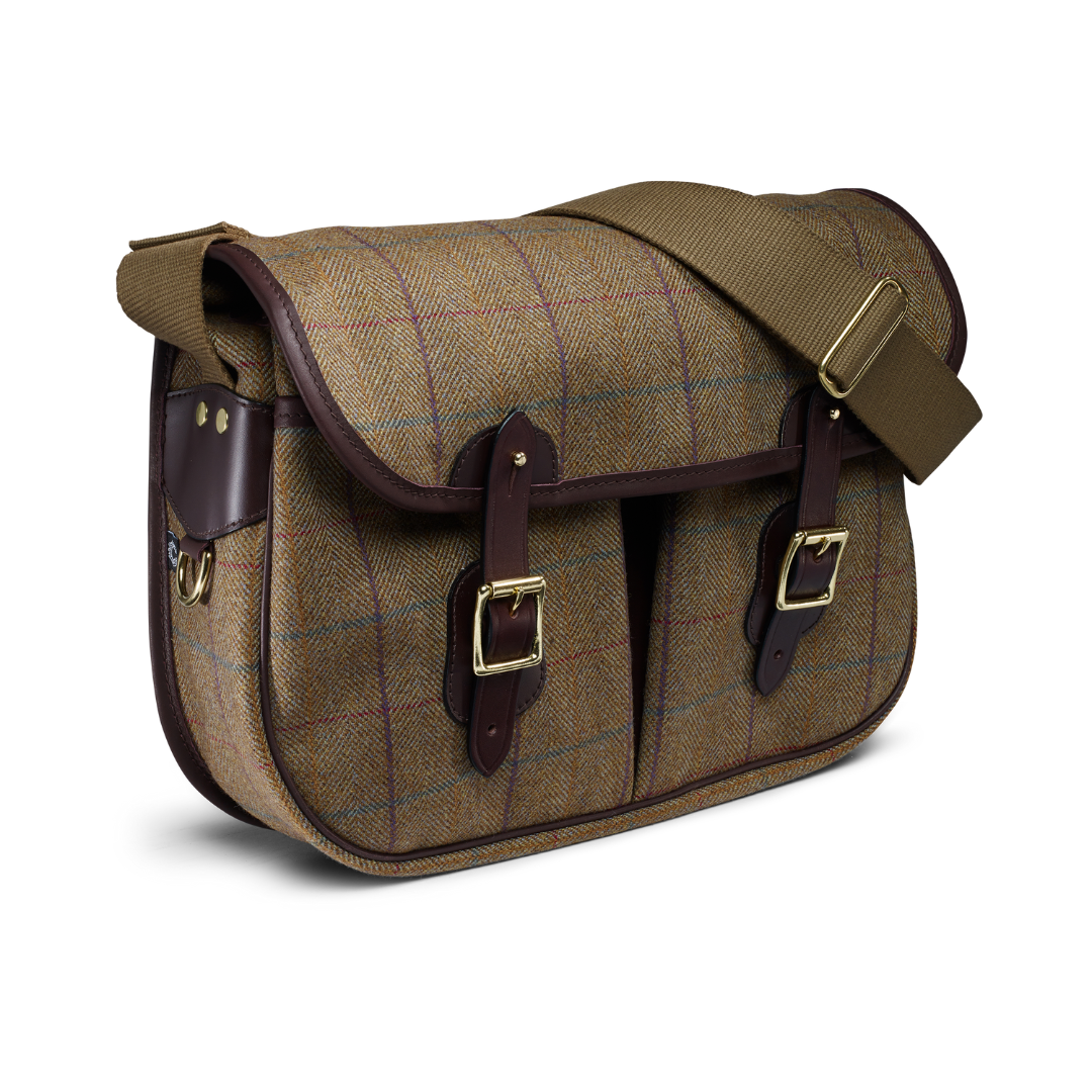 The Croots Helmsley Tweed carryall bag has a good-sized main compartment, a full-width rear pocket, and two leather-trimmed pockets on the front with flap closure. The cotton webbing shoulder strap is fully adjustable and a comfortable 2" wide. Access to the bag is by using either the solid brass buckles or the quick-release brass studs. Authentic British tweed, pair with the Croots cartridge bag, shotgun slip, or tote in beautiful Burgundy tweed.