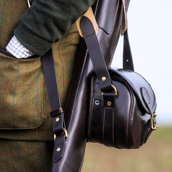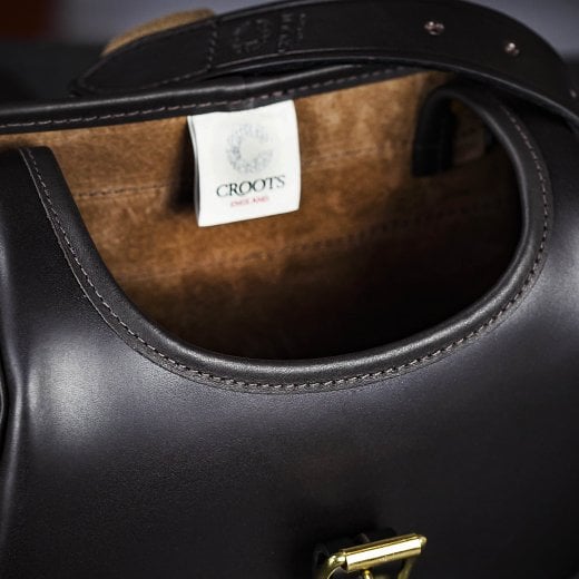 This exquisite leather is now made into a luxurious cartridge bag with the Croots' craftsmanship, using vegetable-tanned bridle leather straps and trims, solid brass buckles, and hand-stitched detail throughout.