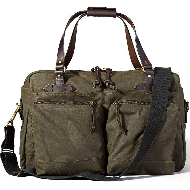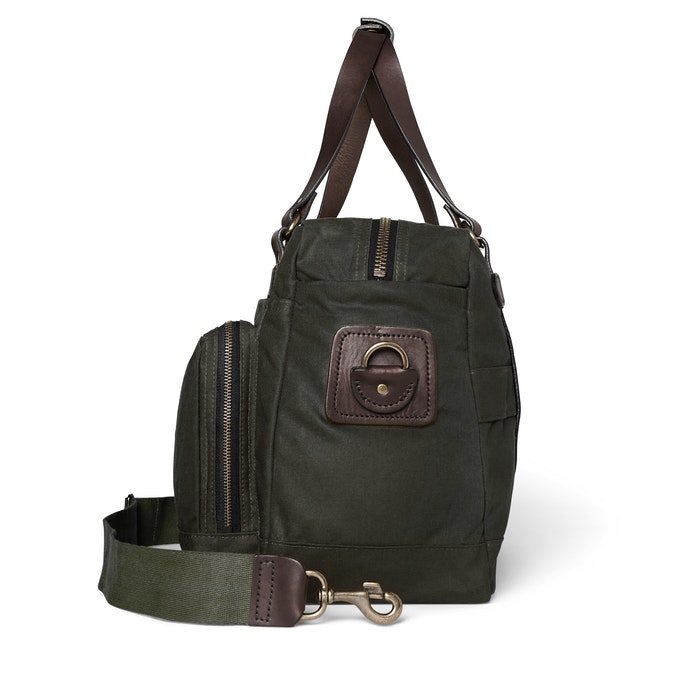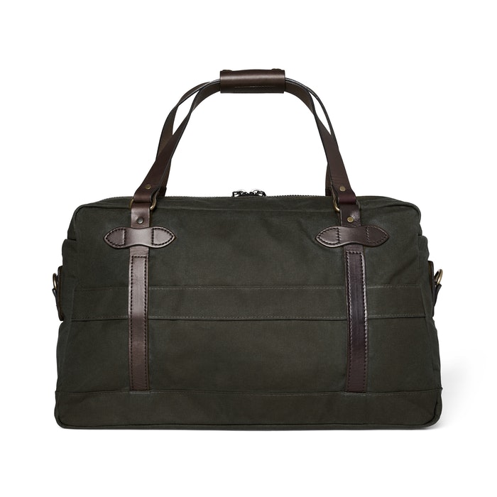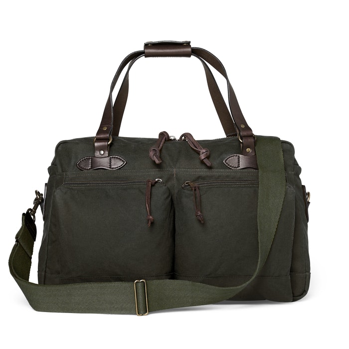 An overnight bag with a reinforced base and exterior pockets. The 48-Hour Tin Cloth Duffle Bag is ideal for overnight and weekend trips. Oil finish Tin Cloth sheds rain and snow to keep your gear dry. An adjustable, removable shoulder strap allows shoulder or cross-body messenger carry. Equipped with Bridle Leather straps for hand carry, and a trolley strap for use with rolling check-in luggage. Use it on the jobsite, in the field or as a carry-on bag – this versatile duffle is up to the task.