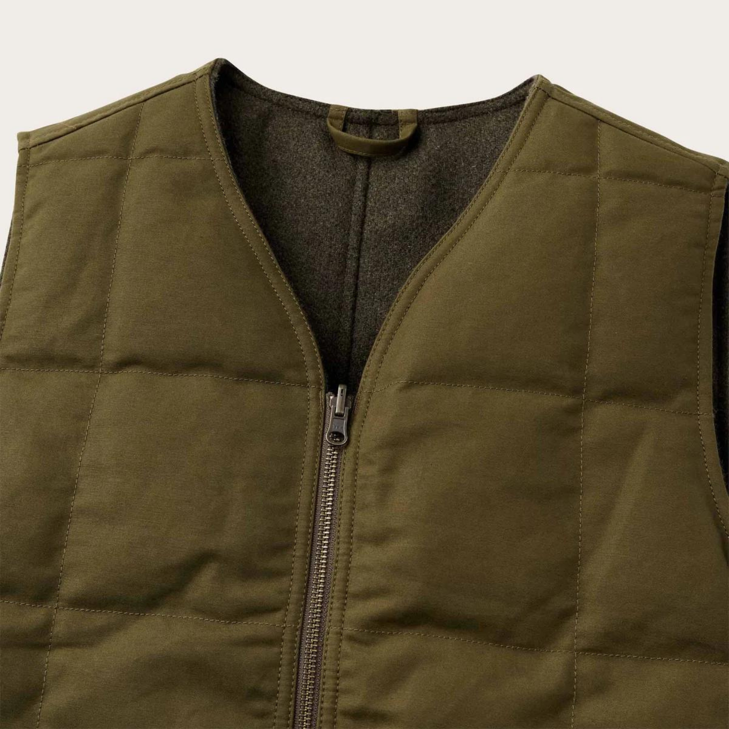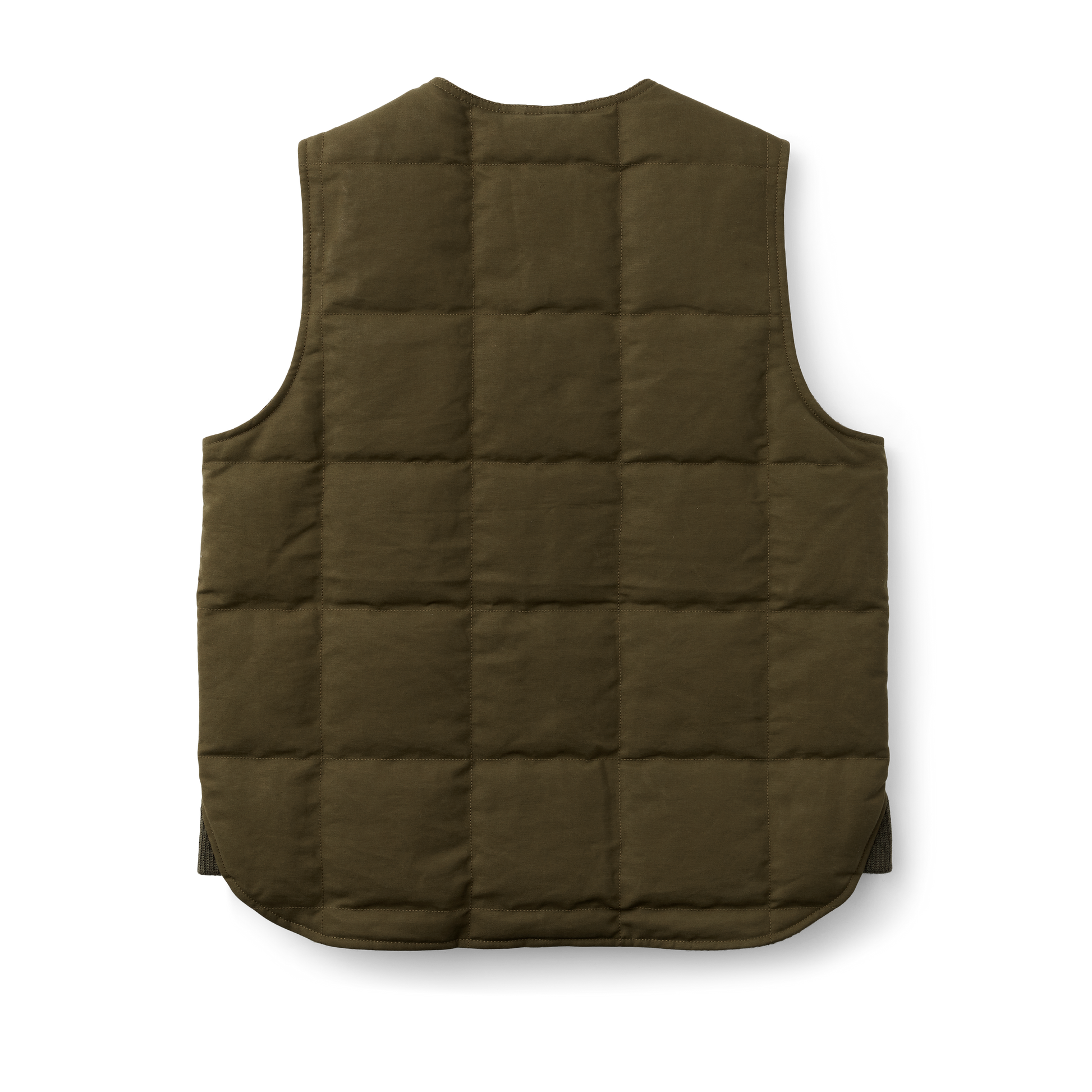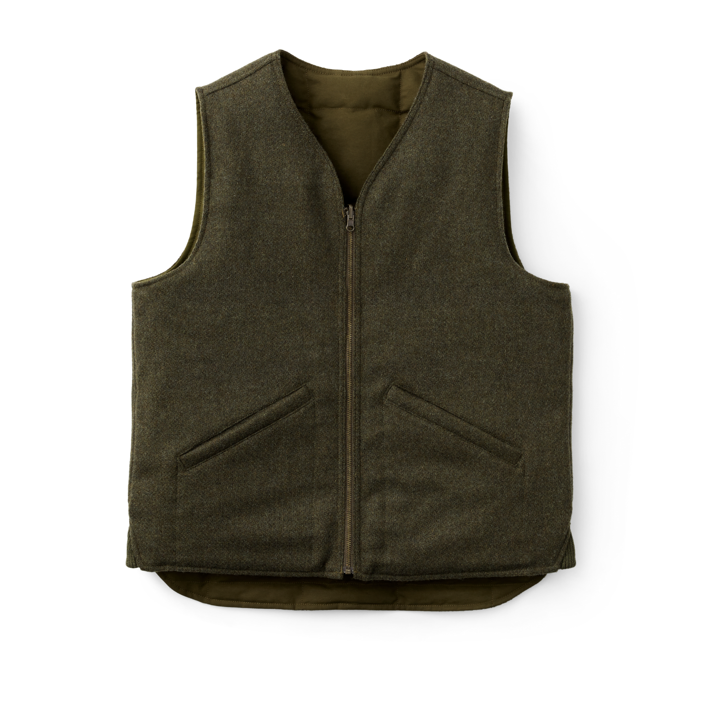 Filson's versatile Buckland Down Vest combines lightly waxed cotton, 100% wool, and goose down into an all-purpose warm layer. The 650FP goose down, nature's warmest and lightest insulation, is responsibly sourced, complying with RDA standards for ethical treatment of the geese that provide it. Reversible, it features cotton treated for water resistance on one side and warm natural wool on the other. Both sides feature flannel-lined handwarmer pockets, with flapped cargo pockets on the cotton side. The drop-tail hem provides added rear coverage and rib-knit gussets at side seams provide ease of motion. Zippered front closure.