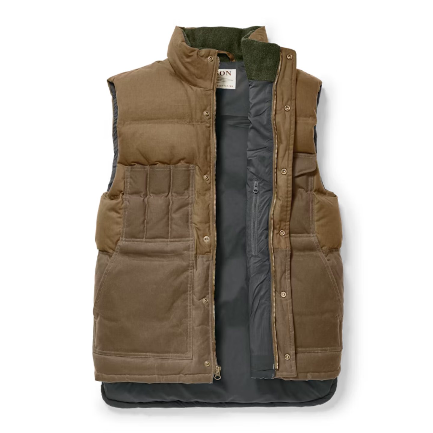 The Cruiser Down Vest’s shell is mostly built with Cover Cloth, Filson's lightest-weight oil finish waxed fabric–thoroughly saturated with their special wax mixture to ensure maximum water resistance. Filson deployed Shelter Cloth, their midweight oil-finish fabric, for the pockets and lower-back for added durability. Merino wool lines the collar, so your necks feels warm even if snow blows under the brim of your hat. The front pockets are arranged much like Filson's work vests, with side-entry hand pockets and snap-flap cargo and slotted-utility pockets. The Cruiser Vest is lined with 1.4-oz. ripstop nylon, so lightweight it’s virtually unnoticeable apart from the comfort it provides.