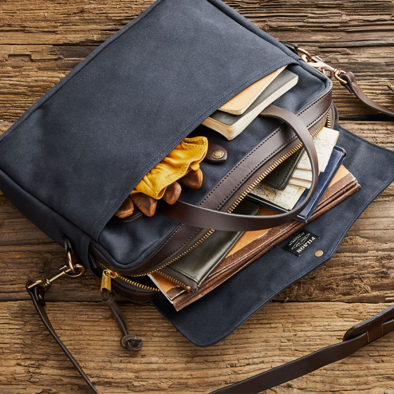 It’s built with industrial-strength Rugged Twill, Filson's signature material from British Millerain that’s proven its mettle for over thirty years carrying their customer’s heaviest loads. This 2-ply by 3-ply cotton twill is lightly-waxed to create a barrier against rain, snow and mud, keeping your gear dry no matter the storm. The exceptionally-tight weave helps Filson's Rugged Twill withstand the abrasion of sliding around in truck beds and on conveyor belts or concrete floors. The leather handles and straps are cut, burnished and edge-dyed in the Seattle factory from Bridle Leather hides vegetable-tanned by Pennsylvania’s Wickett & Craig, the iconic tannery since 1867. Each hide is slowly steeped in a special bark-tannin solution, with tallows and waxes “hot-stuffed” into it during the final stages. This eco-friendly tanning process slowly transforms cowhide into saddle-grade, pliable leather that’s equally suited for horse tack and Filson luggage. The heavy-gauge brass zipper is rustproof, virtually indestructible, and reinforced with dual strips of 12-oz. Bridle Leather. All of this is stitched together with heavy-duty, cotton-wrapped polyester thread, to ensure a briefcase that will provide decades of reliable service.