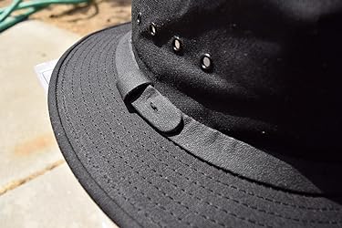 A classic full-brim hat in water-resistant Tin Cloth. Whether in the field or on the job, Filson's classic Packer Hat keeps you protected from the elements. Water-resistant oil finish Tin Cloth fabric withstands abuse for decades. Features a cotton sweatband, leather hatband and ventilating grommets in the crown. 2-1/4" brim keeps the rain out of you face and off your neck.