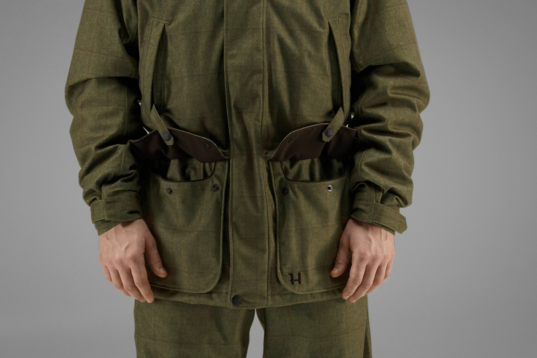 The Stornoway HWS jacket is made from robust, hard-wearing tweed that has been Teflon®-treated to enhance the wool’s natural dirt- and water-repellent properties. The jacket has a windproof and waterproof HWS® Härkila Weather System 2-layer membrane, to withstand sleet and rain. Along with a classic check lining, the jacket features an action back, to ensure excellent freeedom of movement when shooting. The Stornoway 2.0 HWS jacket has two large cartridge pockets with drainholes and a quick load function, which holds the pocket open with a press stud, for easy access to cartridges for reloading. The jacket also has two handwarmer pockets and a hidden pocket under the main zip flap for a mobile phone or similar, all with zips. There is also a zipped inner pocket, and the cuffs are adjustable with two button positions. The jacket features a high collar and a strong, two-way main zip covered by a robust wind-resistant flap with press studs. There are elasticated drawstrings at the waist and lower hem. The jacket has a classic fit.