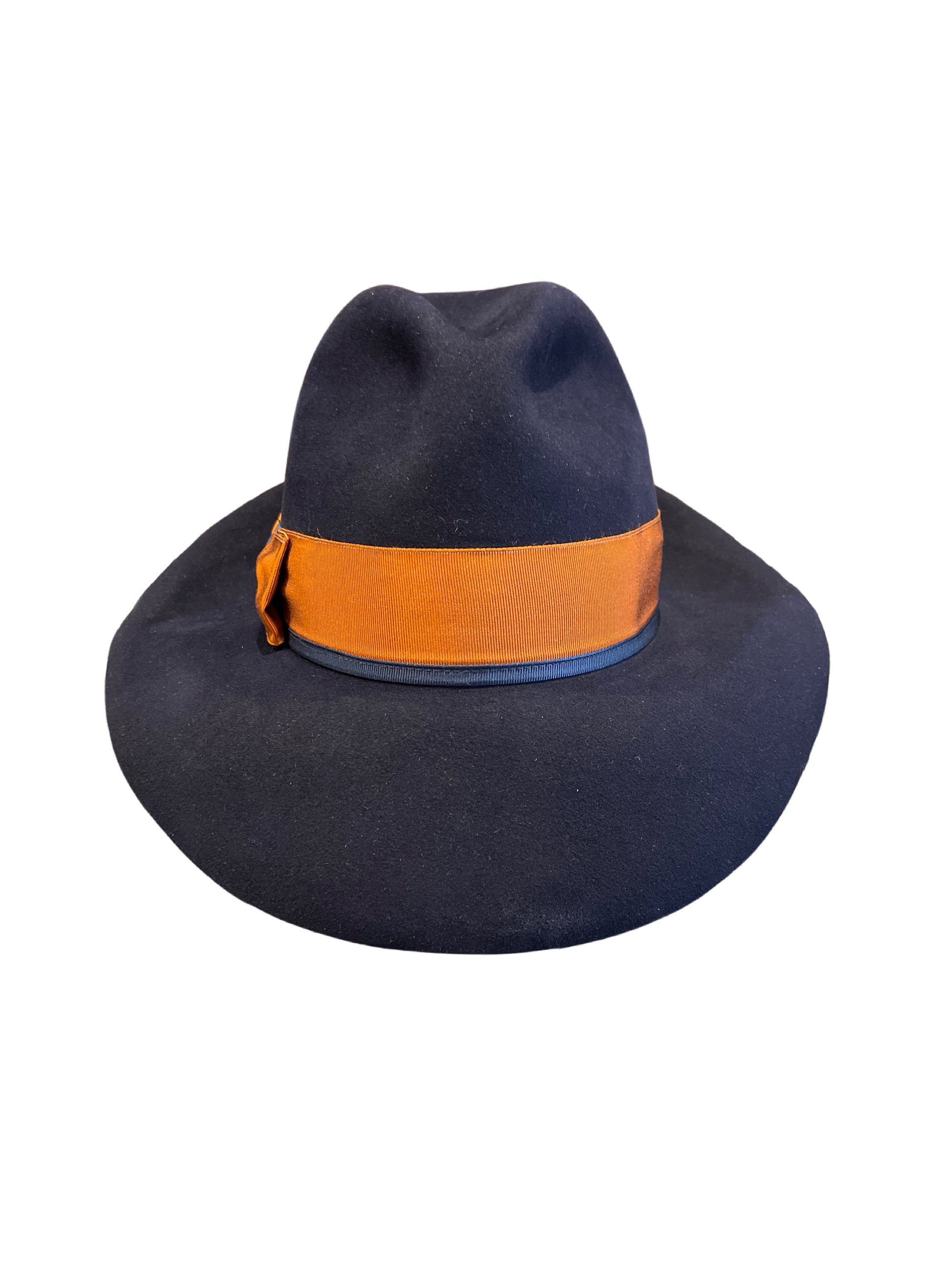The Paula model is a very elegant lady's hat. The soft brim has a deep front dip to accentuate cheekbones, and a short, turned up back to accommodate hairstyles and/or jacket collars.