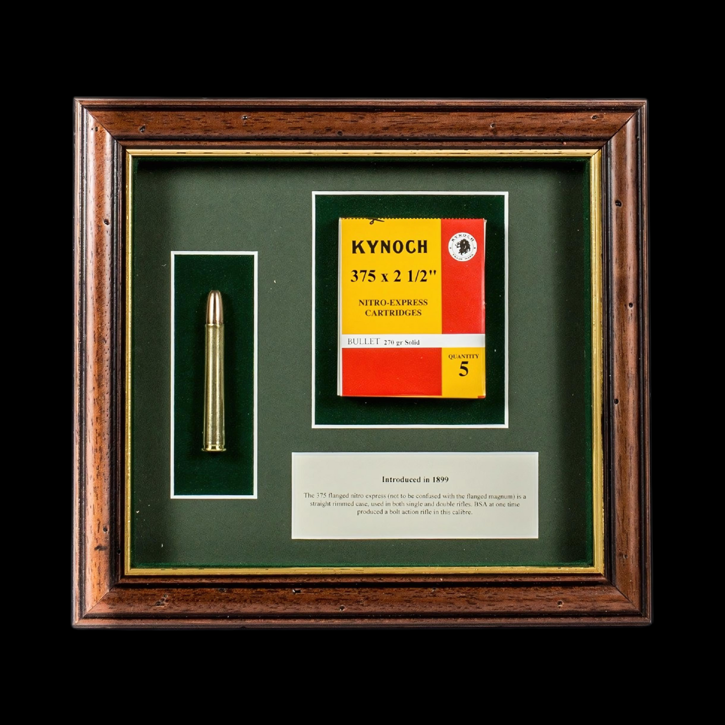 These beautiful Cartridge Boards feature a decorative wood and glass frame, green wool felt background, and clear descriptions. They can be displayed separately or combined to create an informative display of these iconic cartridges. Custom made by The Sporting Gentry, leader in Sporting design.