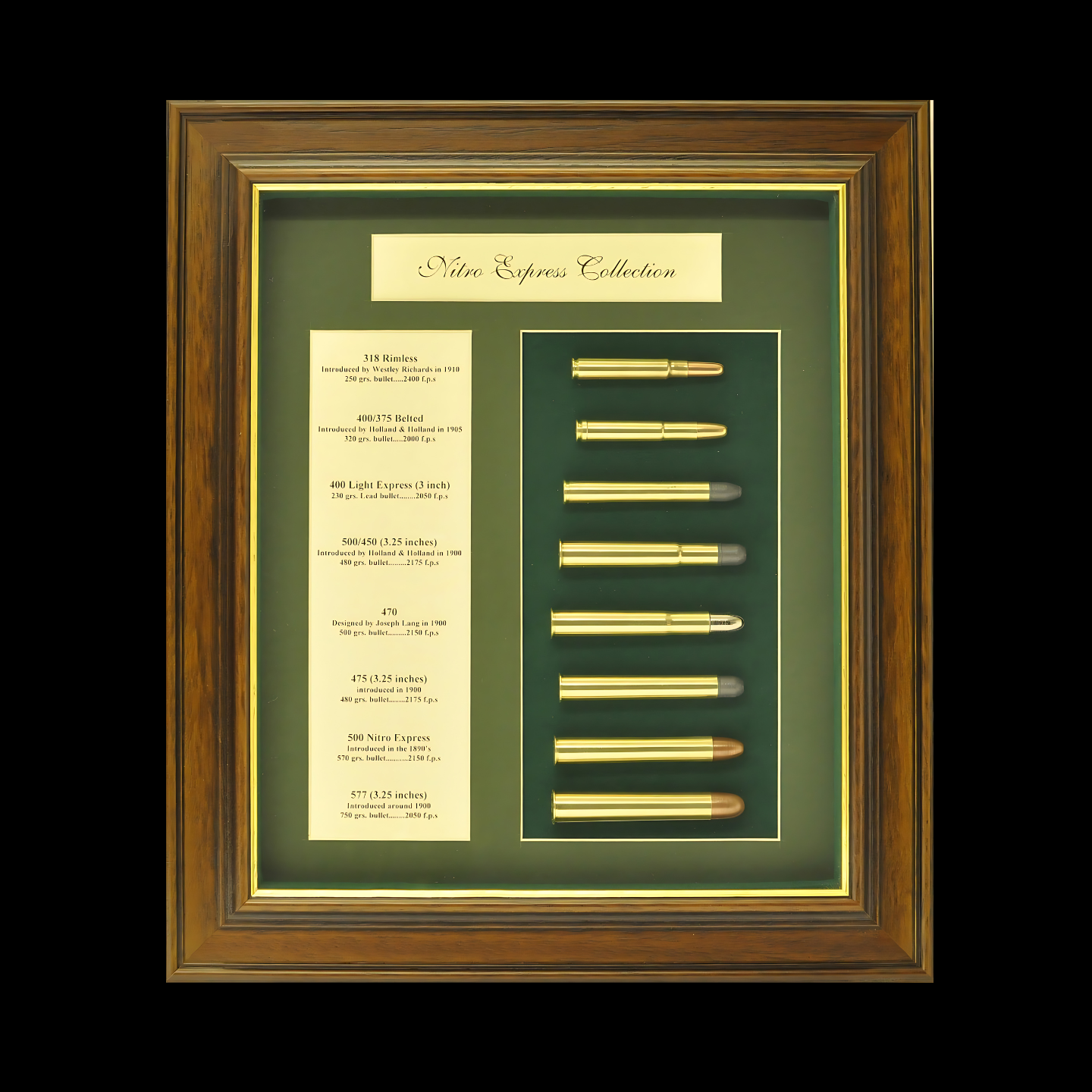 These beautiful Cartridge Boards feature a decorative wood and glass frame, green wool felt background, and clear descriptions. They can be displayed separately or combined to create an informative display of these iconic cartridges. Custom made by The Sporting Gentry, leader in Sporting design.