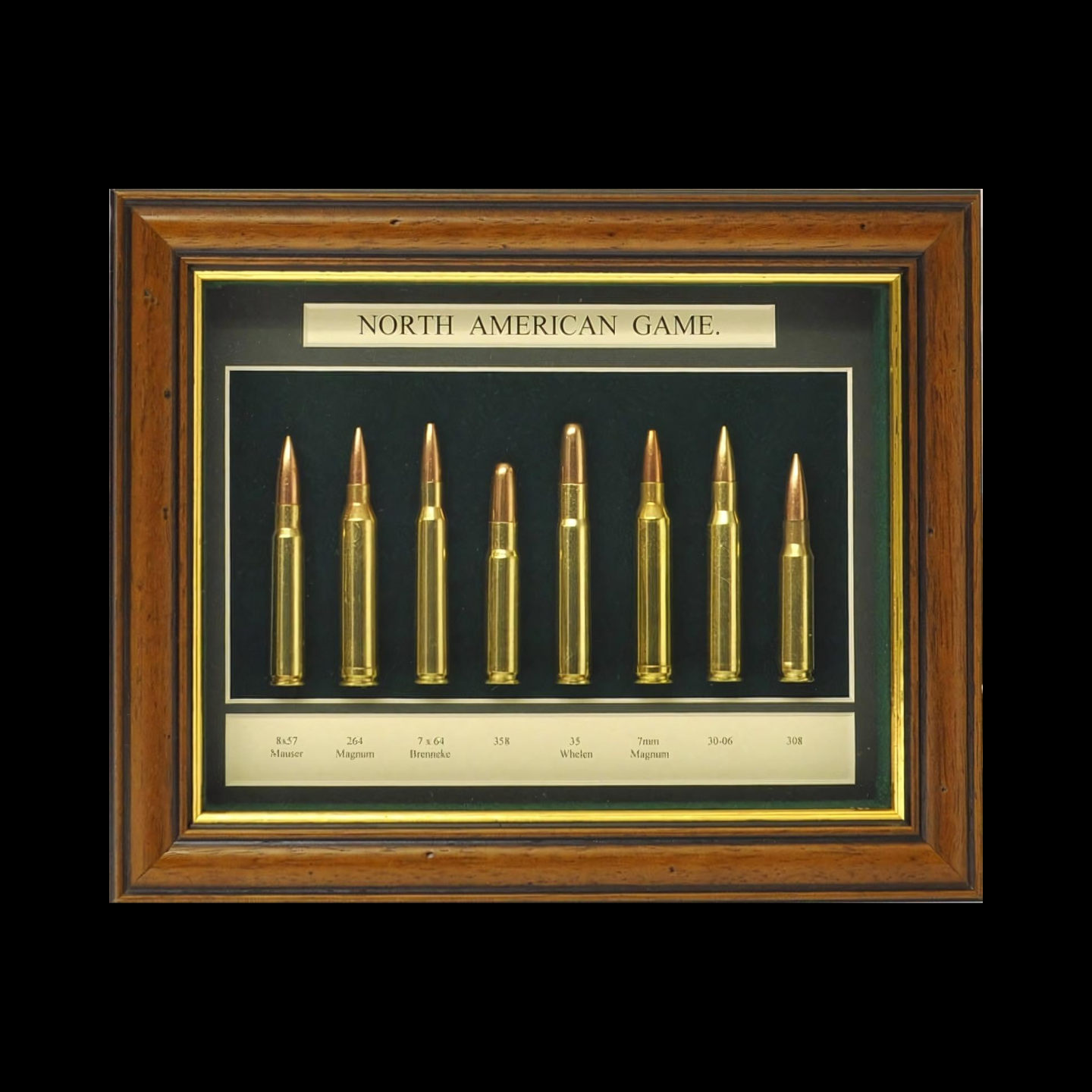 These beautiful Cartridge Boards feature a decorative wood and glass frame, green wool felt background, and clear descriptions. They can be displayed separately or combined to create an informative display of these iconic cartridges.