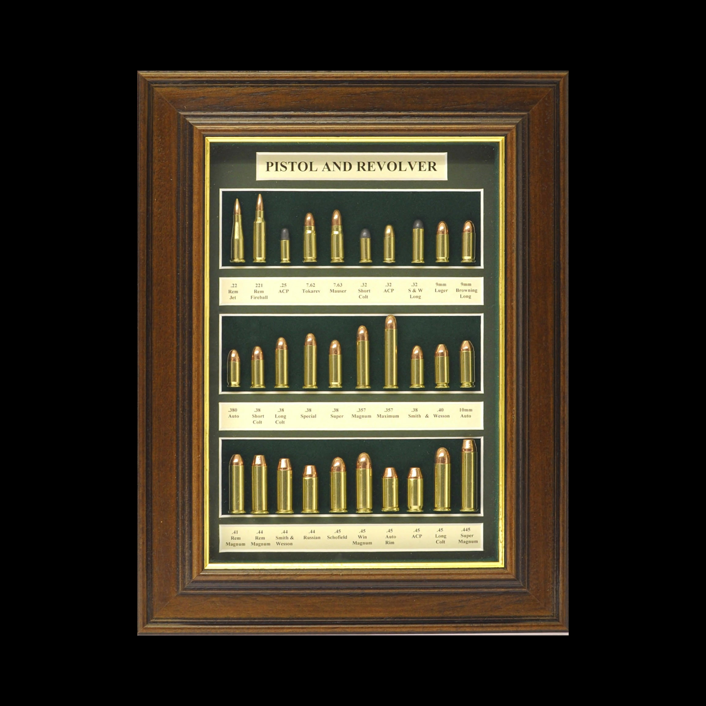 Mounted in an ornate frame, behind glass on green baize. .22 Remington Jet to .45 Long Colt.
