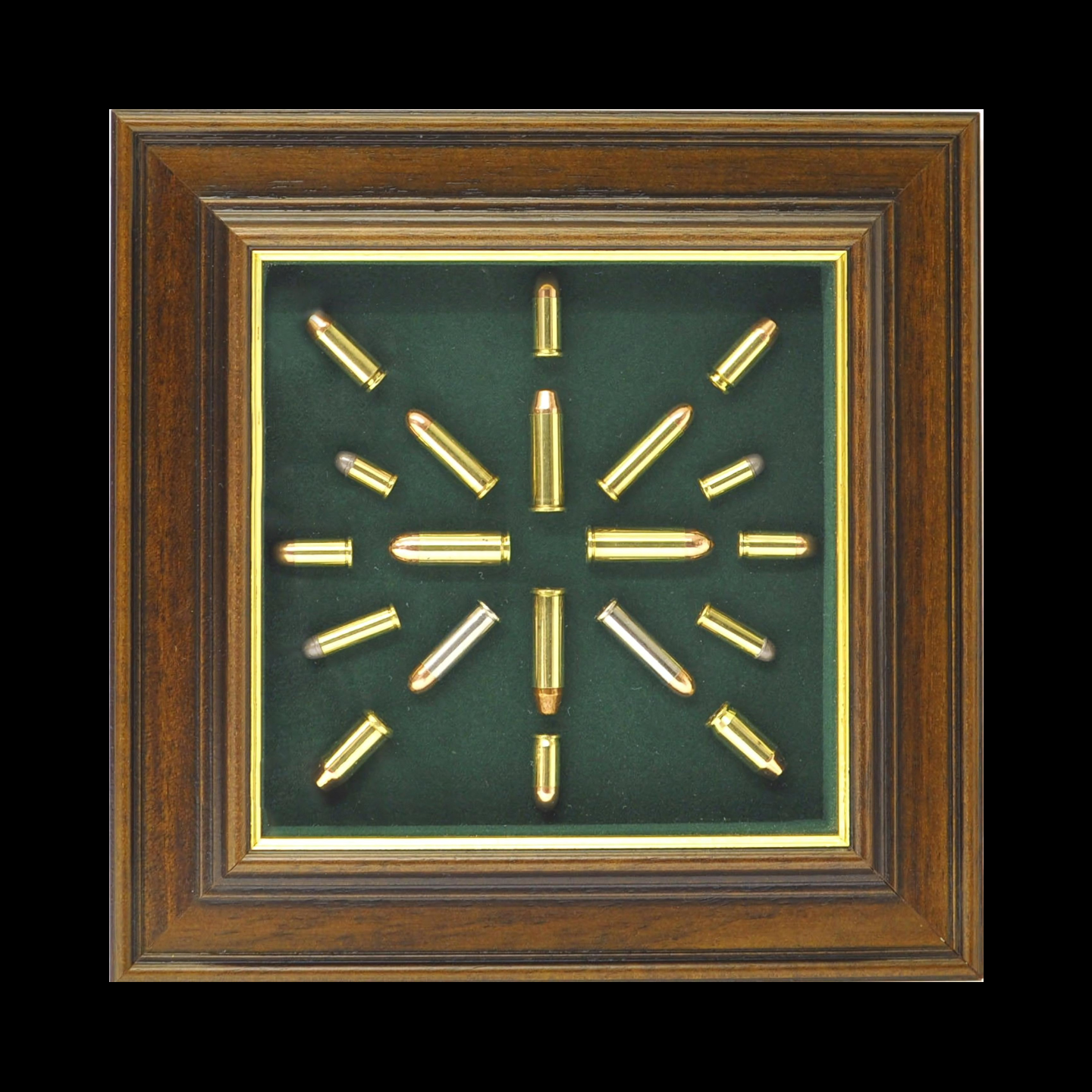 Mounted in an ornate frame, behind glass on green baize. .32 S&W to .45 Winchester Magnum.