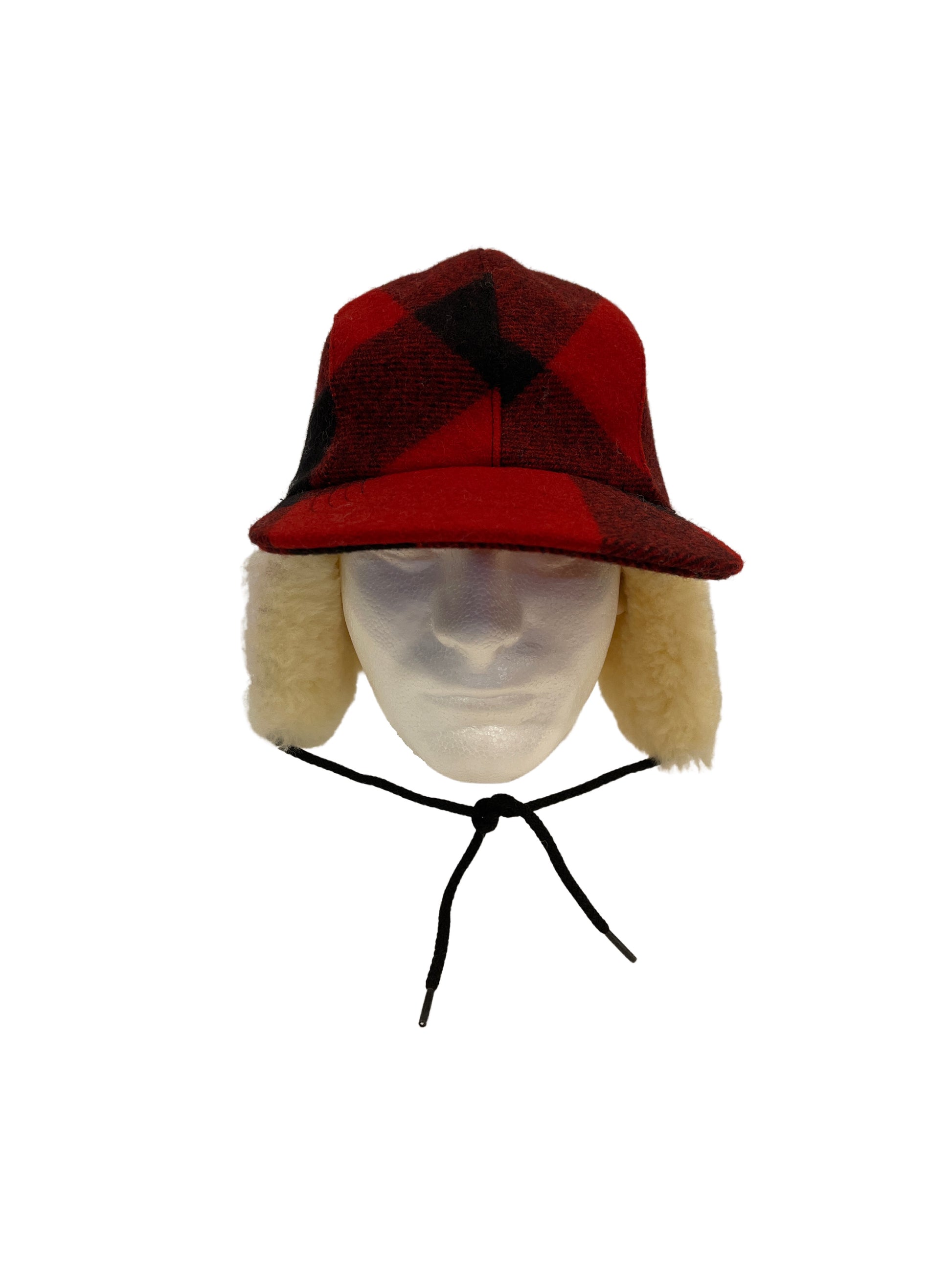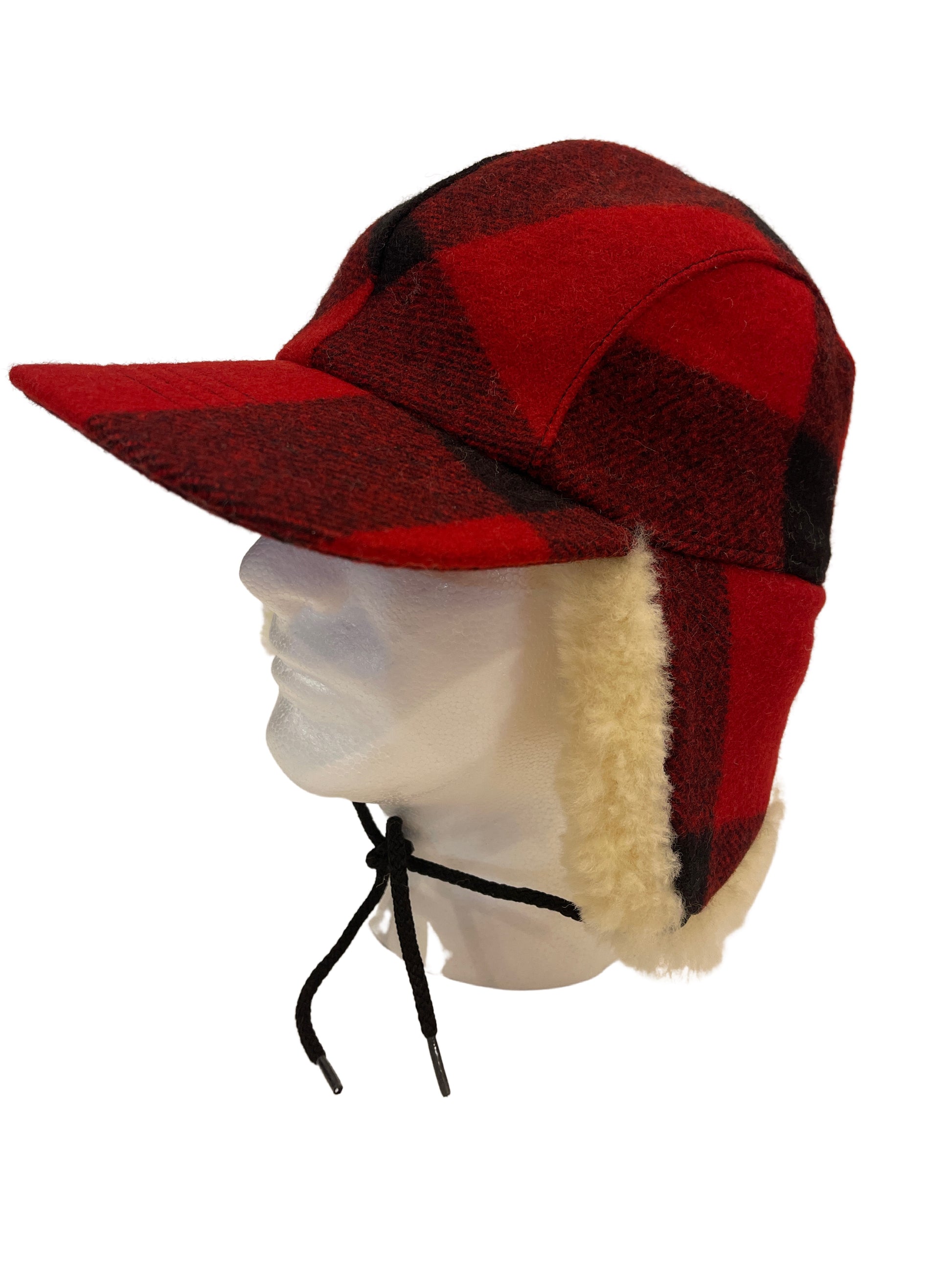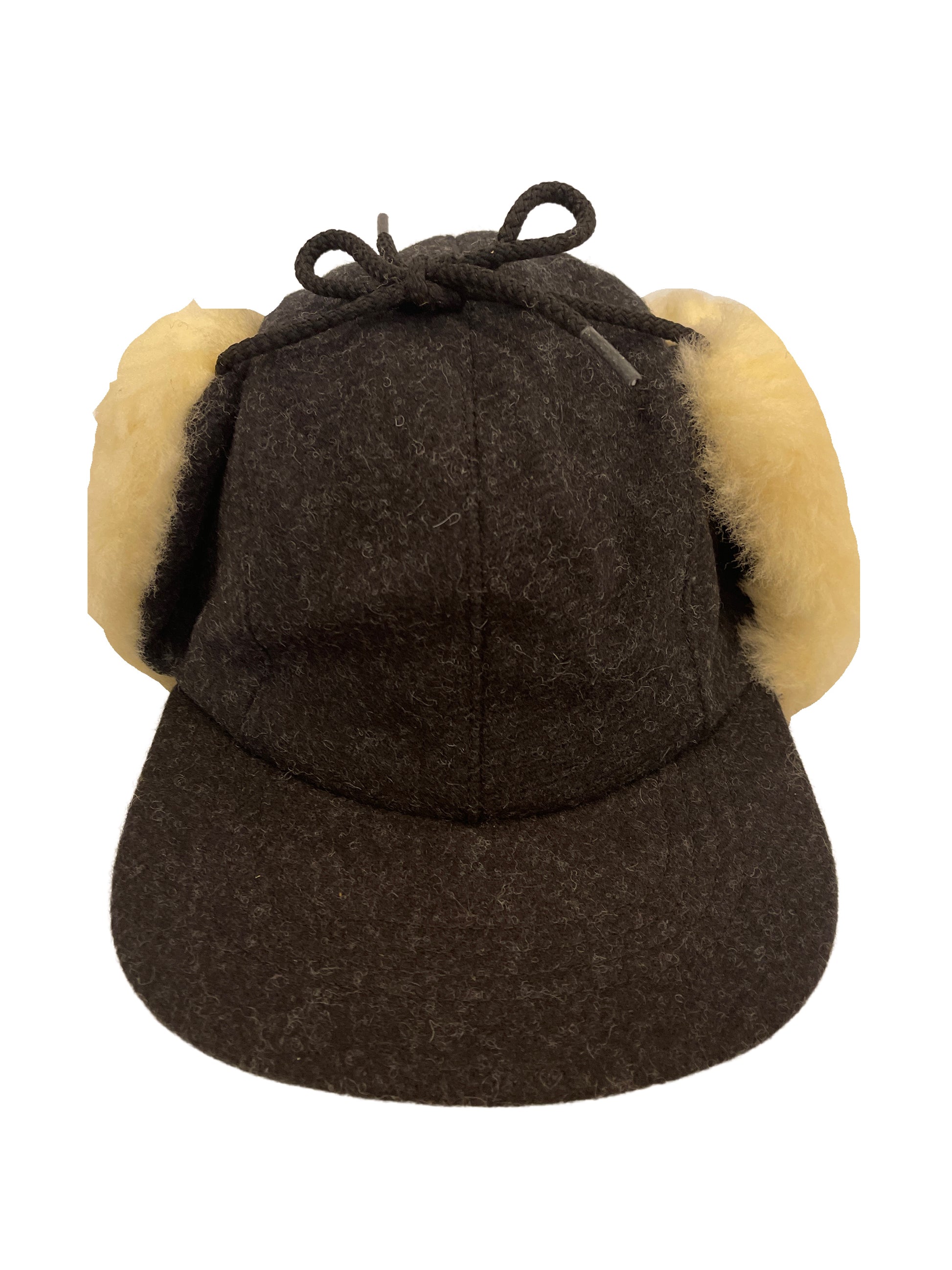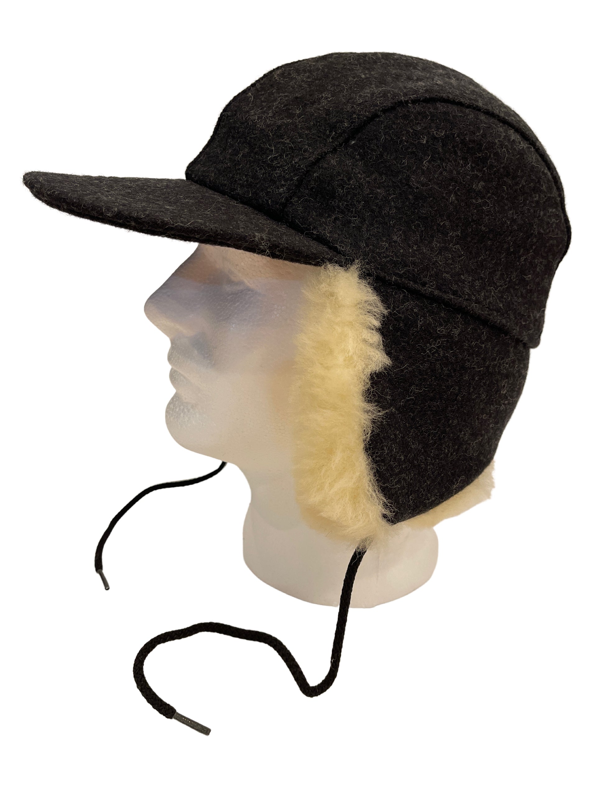 A classic insulated wool cap with tie-back shearling-lined earflaps and an insulated crown.