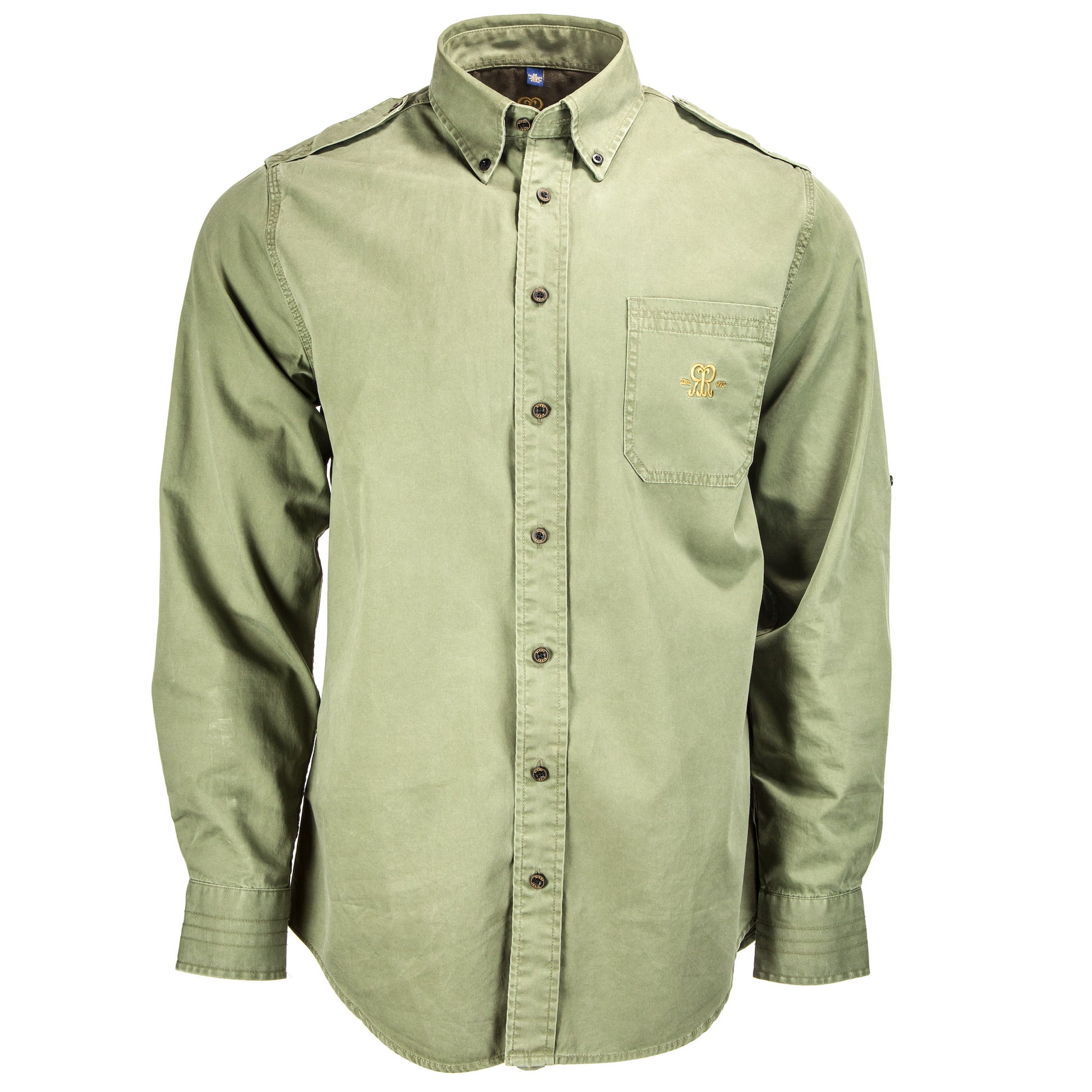A go-anywhere, go-to hunting shirt that will serve you just as well on plains, mountains, or in forests. Woven in a uniquely adaptable dark olive coloring, the shirt features the Rigby ‘Double R’ logo embroidered on the button-free breast pocket.