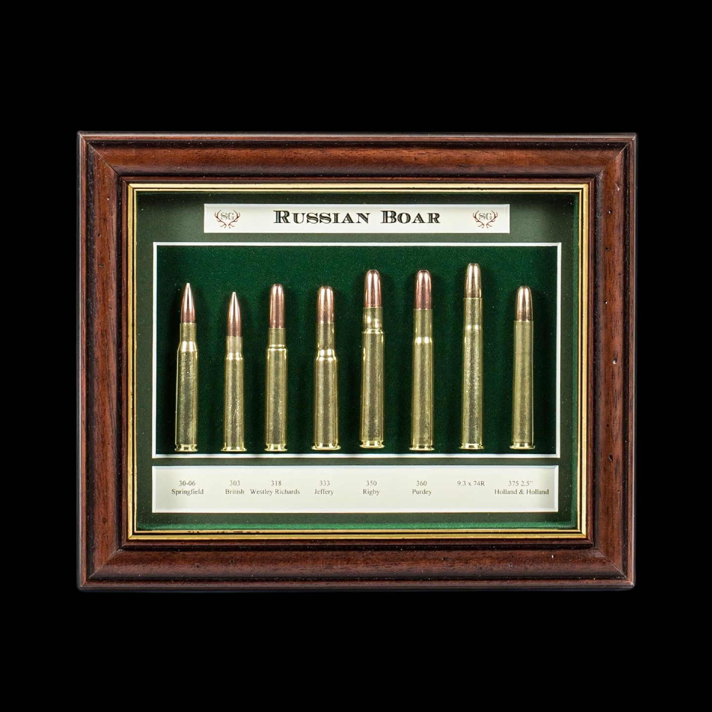 These beautiful Cartridge Boards feature a decorative wood and glass frame, green wool felt background, and clear descriptions. They can be displayed separately or combined to create an informative display of these iconic cartridges. Custom made by The Sporting Gentry, leader in Sporting design.