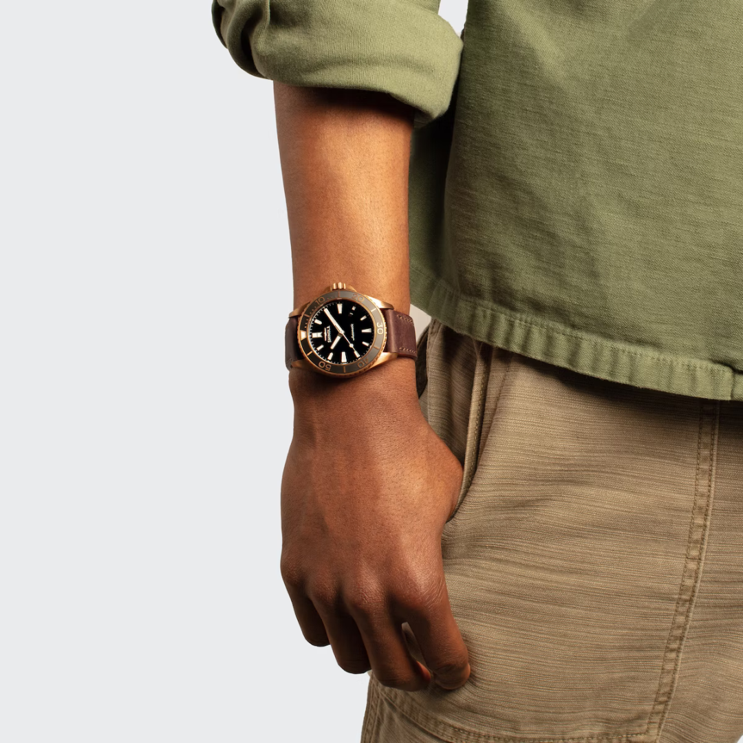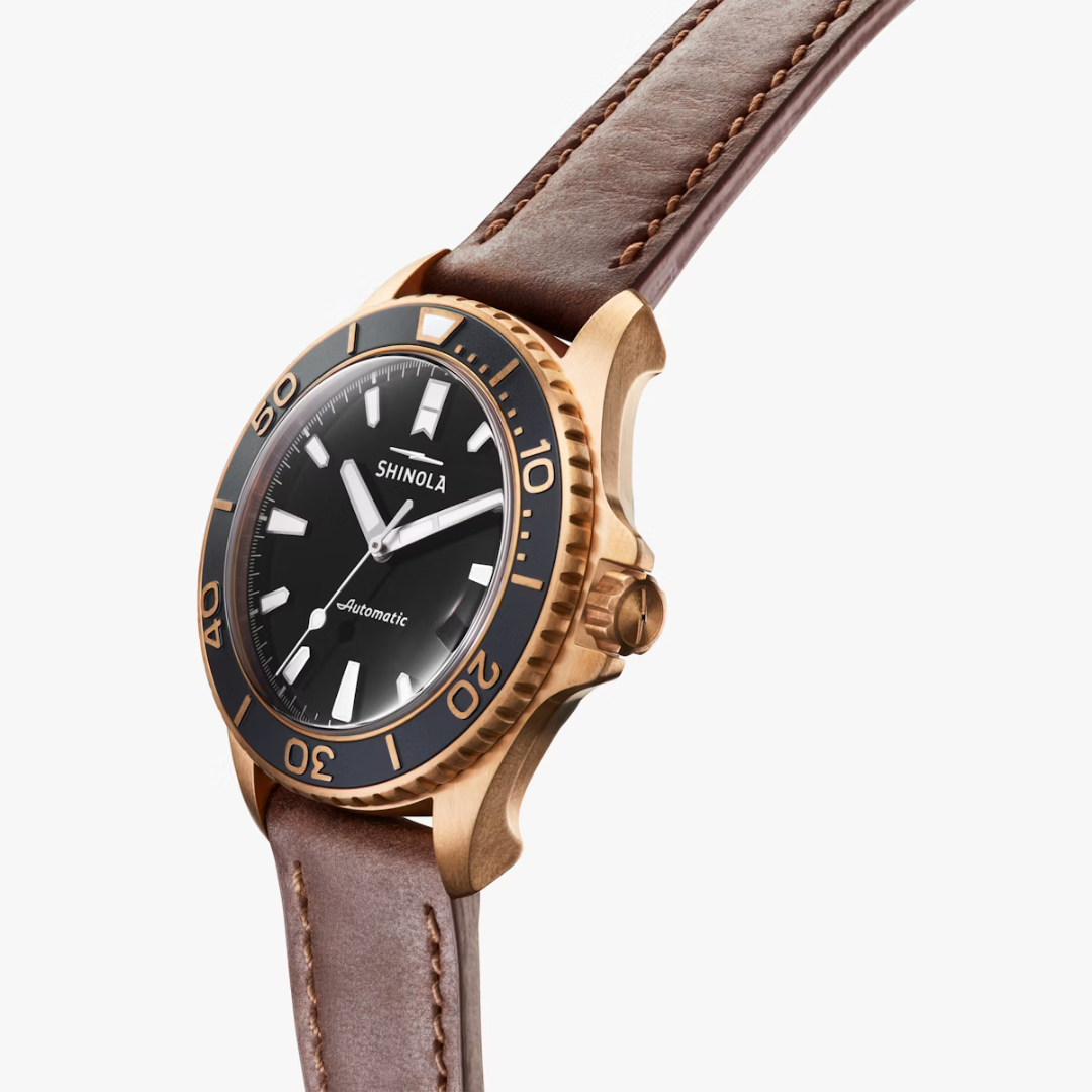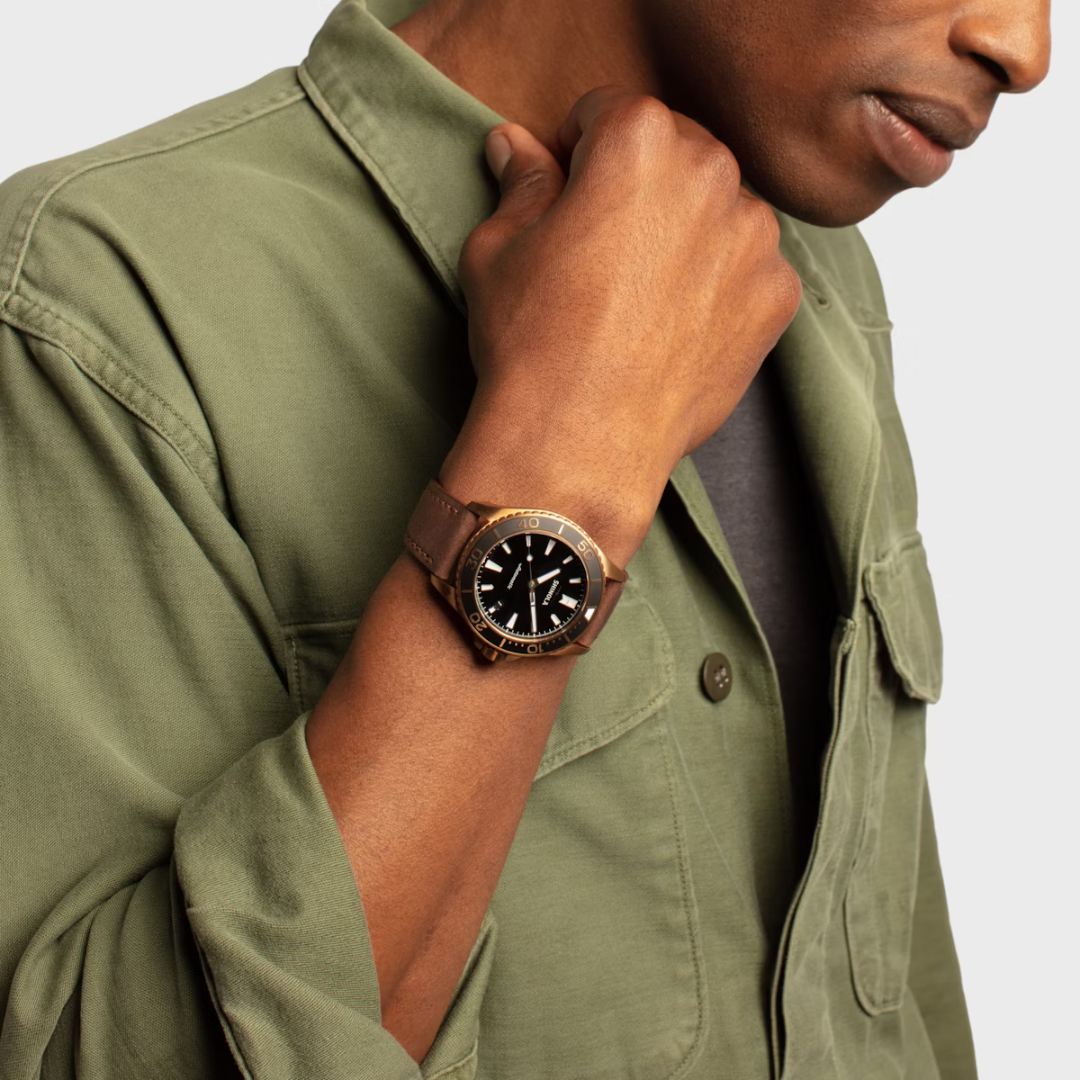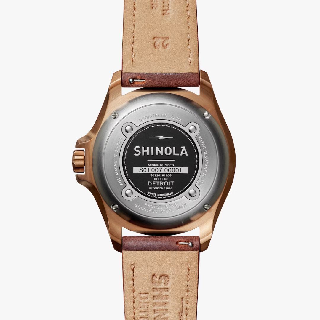 Meet the Kingpin of your watch collection. The Bronze Monster Gift Set will transport you back to the 1920s with an automatic timepiece that features a bronze case and dark colorways. Inspired by the Prohibition era and the stealth of rumrunners on Michigan waterways, this Shinola Monster commands attention in the most unassuming way. Powered by the SW200-1 automatic movement, which features 26 jewels and a 38-hour power reserve, this watch has a stainless steel caseback and an impressive dive watch aesthetic. Complemented by a khaki nylon strap, the gift set also includes a premium teak leather strap for easy swapping to suit your style. This 43mm timepiece lends itself to a wearer who has a bit of a rebellious side.