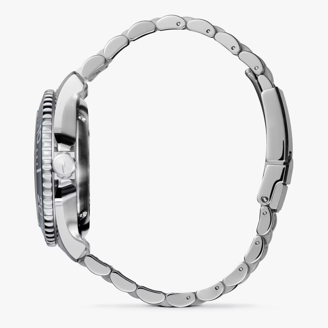 This 43mm Shinola Monster hits the mark when it comes to a dive watch you can trust. Its technical acumen makes the iconic aesthetic of Shinola an added bonus. Powered by the SW200-1 automatic movement, which features 26 jewels and a 38-hour power reserve, this high-grade 316L stainless steel timepiece is meticulously engineered to withstand extreme pressure and has a depth rating of 1,000 feet. With durable, anti-reflective sapphire crystal and an anti-magnetic shield, the Shinola Monster is designed specifically with divers in mind. A unidirectional bezel keeps track of precious time underwater, a stainless steel three-link bracelet with a micro-adjustable clasp provides a secure fit while diving. While its midnight blue dial reminds us of the stunning ice formations across Lake Michigan in the coldest months of winter, the star quality of this timepiece is its performance.