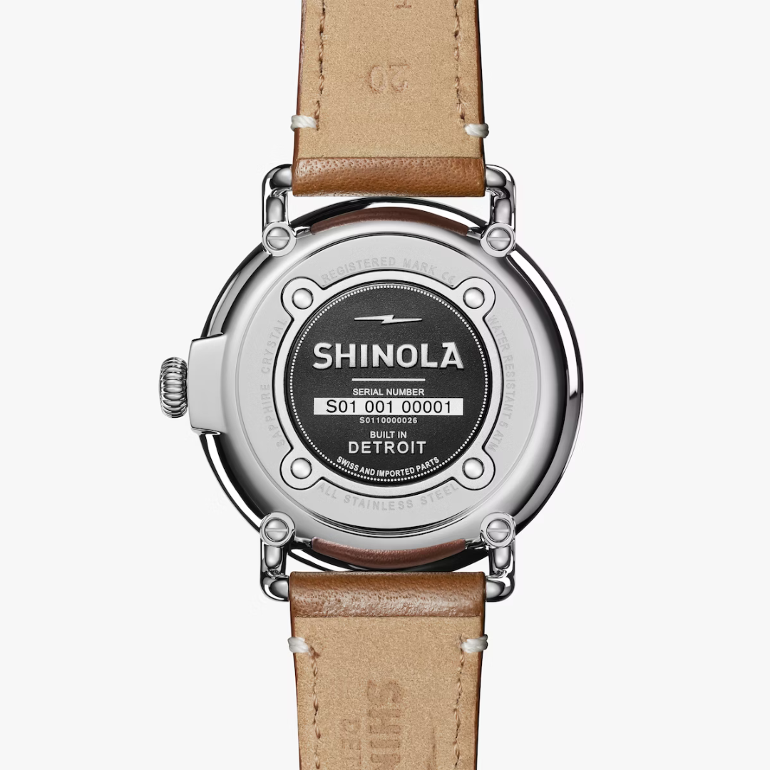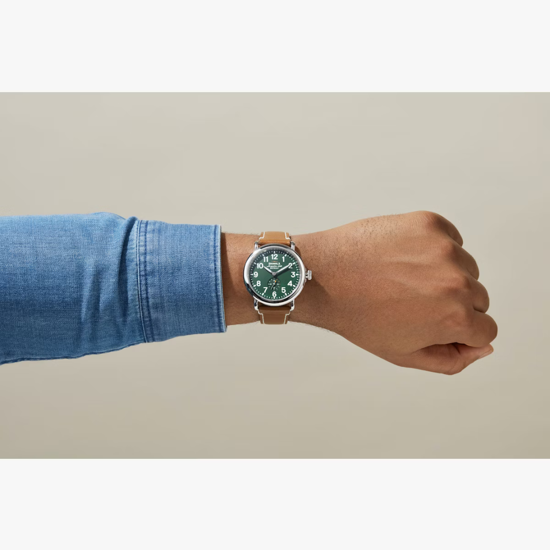 It's hard not to envy a face like this one. This 41mm Runwell features a rich green dial set in a solid stainless steel case finished with a classic pumpkin crown. The double-domed sapphire crystal protects the watch from scratches through years of wear. The leather strap in maple will develop a unique patina over time to give your timepiece a one-of-a-kind look.