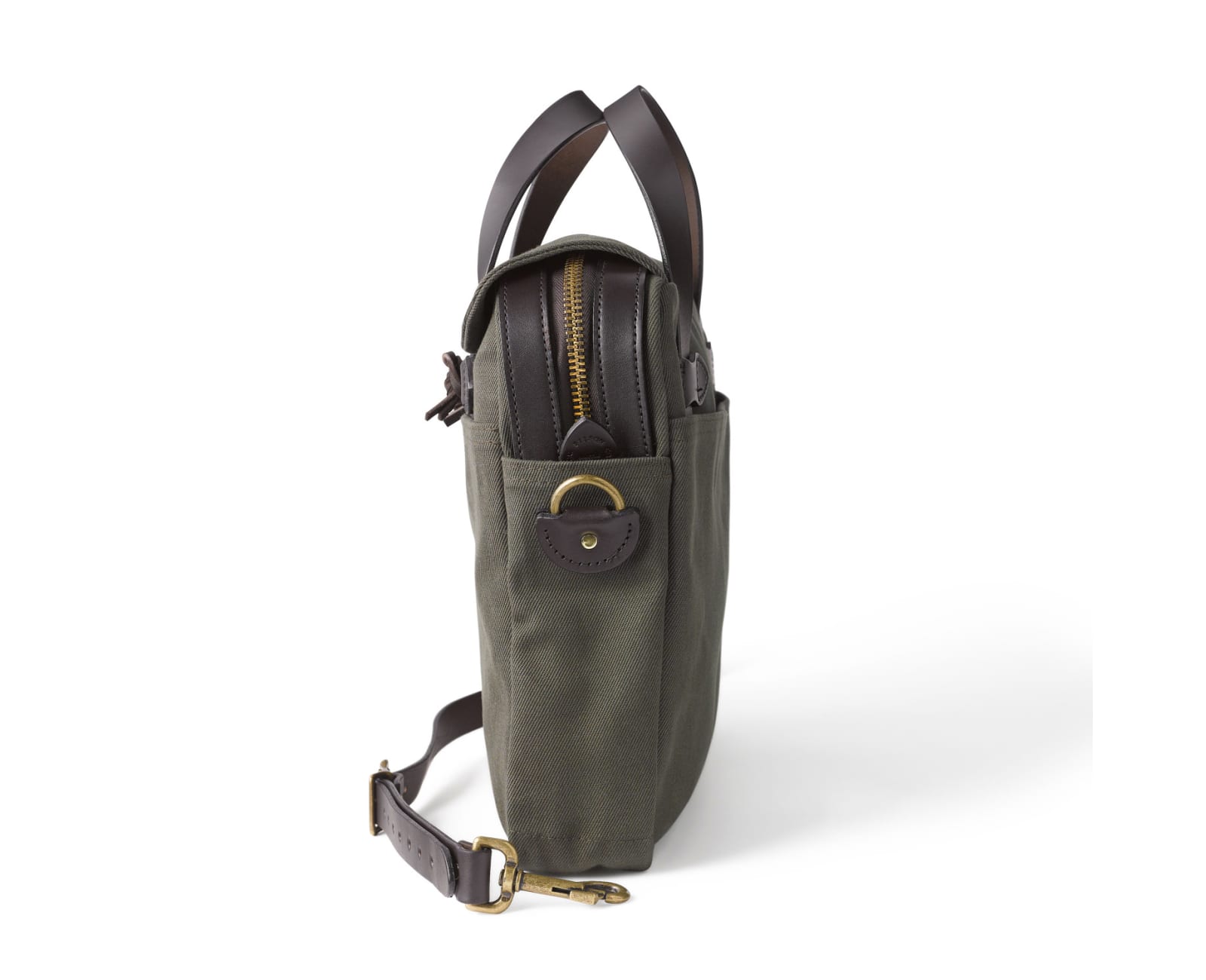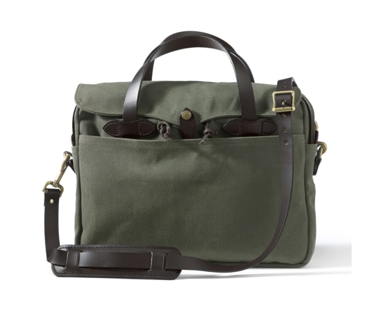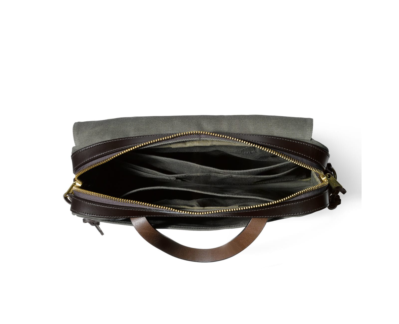This iconic briefcase is made with Rugged Twill, bridle leather and solid brass hardware. Embodying the philosophy that has guided Filson for 125 years: manufacture uncompromising products using the best available materials and construction, products that withstand the rigors of daily use for years on end, that are handed down rather than tossed out. Nearly three decades after its introduction, Filson's iconic briefcase remains a testament to the old-fashioned idea that if a thing is worth doing, it’s worth doing right.