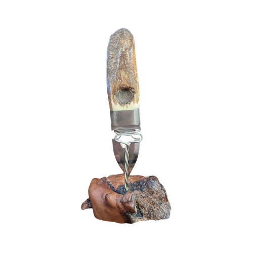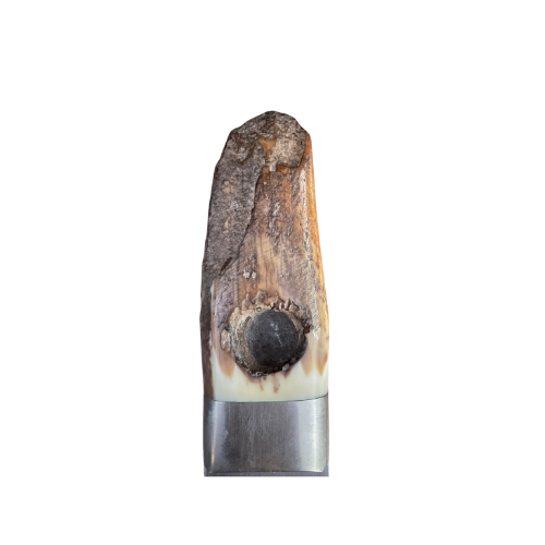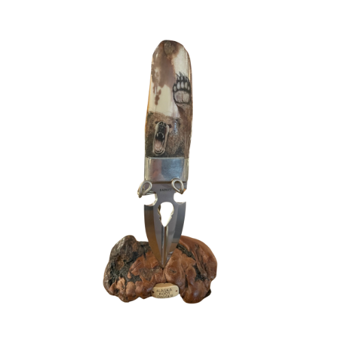 Crafted from an Eskimo artifact, thought to be used as a pocket fire starter, and enhanced with a dramatic scrimshaw grizzly. With thumb grips on both sides, artist signature, and a low-profile display constructed from burl wood, this piece is beyond unique.