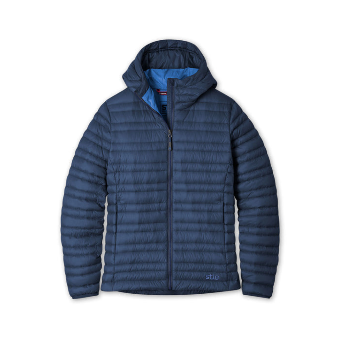 Down hoodies are everywhere in mountain circles due to their lightweight warmth and conditional range. What distinguishes the Stio packable, layerable Pinion is certified responsible HyperDRY™ 800-fill RDS down, which provides premium loft yet won't wet out due to a fill-level treatment. A longer cut than the Pinion Down Sweater, the design features narrow-channel baffles and a flat-front hem for a flattering feminine shape. The halo-adjust, full-vision hood quickly warms up any outdoor escape from cold mornings in camp and unexpected mountain town chills. The shadow ripstop sheds light weather from the surface.