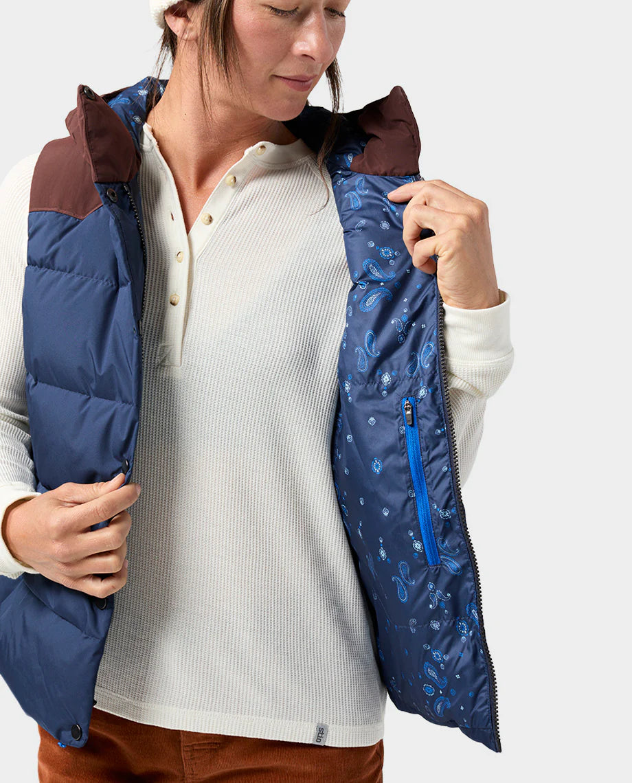 With ranching roots and modern warmth, this trend-forward vest is an adventure in mountain town fashion with toasty, lightweight down and a comfortable, durable outer.
