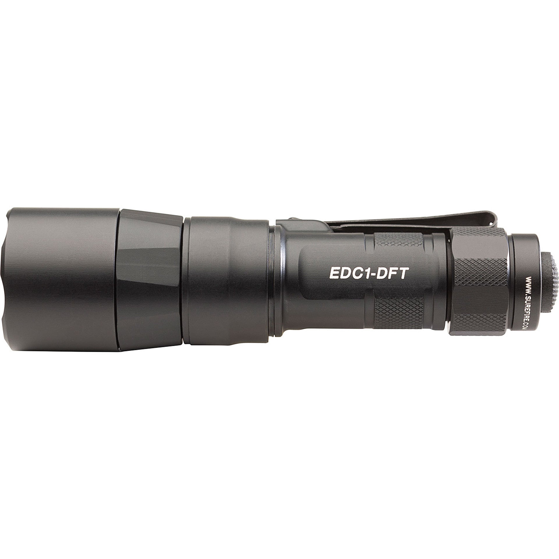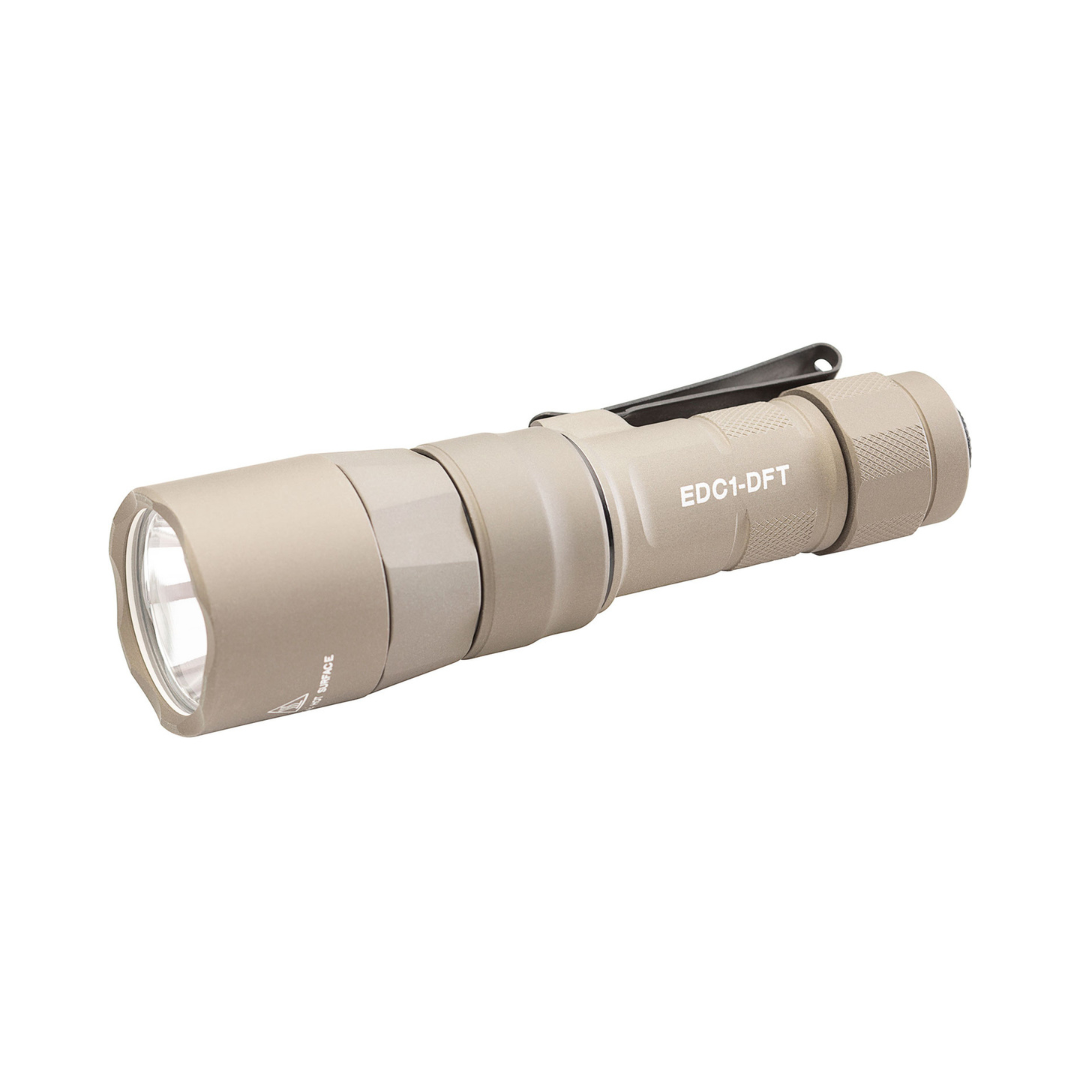 Turbocharge Your Low-Light Vision. SureFire’s Everyday Carry Series punches deep into darkness with the EDC1-DFT, a Dual Fuel, high-candela handheld flashlight that delivers impressive beam designed explicitly for long-distance illumination in a remarkably compact form factor. With a blinding, peak beam intensity of 95,000 candela using the included SF18350 rechargeable lithium-ion battery or 55,000 candela from a single 123A primary battery, the EDC1-DFT's concentrated, tightly focused beam pattern allows you to see farther into the darkness and positively identify any potential threat. In addition, it offers tremendous versatility by providing ample spill light to help the user maintain situational awareness. Constructed of lightweight aerospace aluminum, Mil-Spec hard-anodized, and O-ring sealed to keep out the elements, the body and tailcap are also knurled for a secure grip. A sturdy, two-way clip offers the added flexibility of bezel-up or bevel-down carry. The EDC1-DFT delivers SureFire quality, performance, and dependability in an everyday carry flashlight that provides peace of mind by helping you see farther into the unknown.