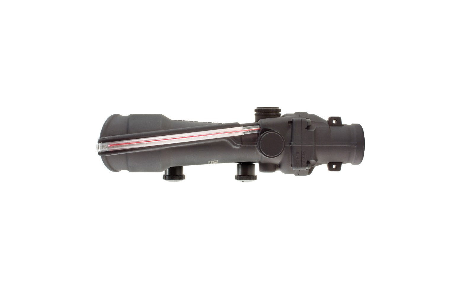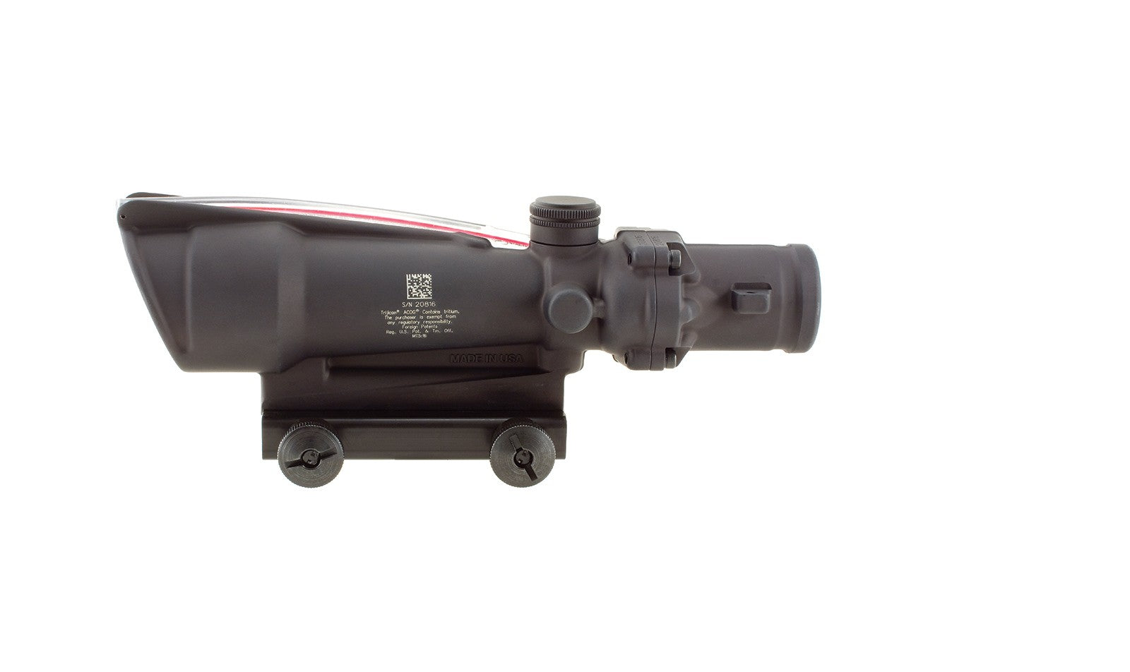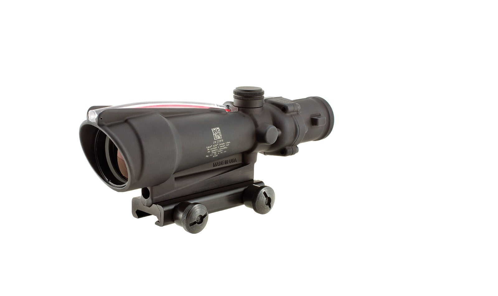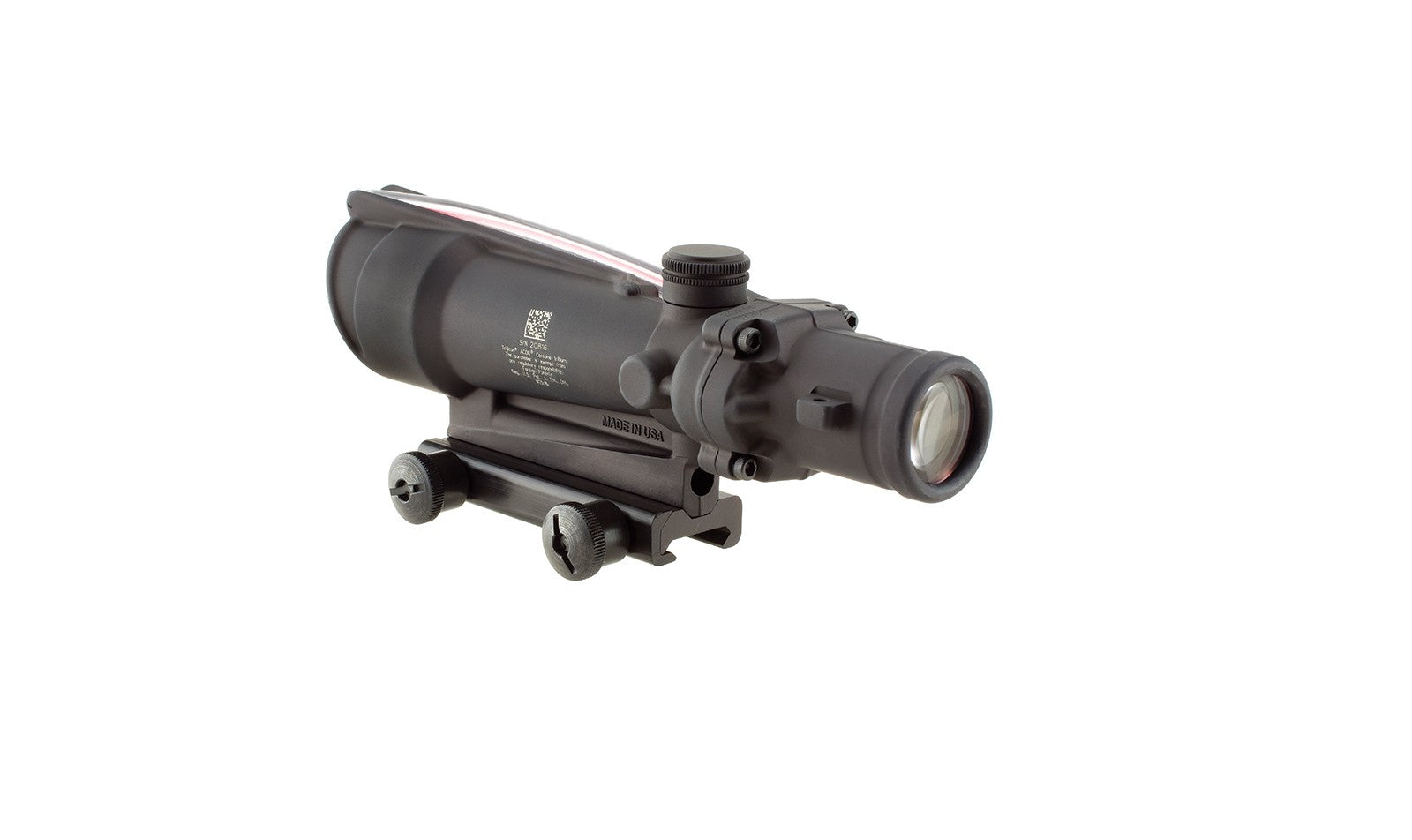 ACOG® 3.5x35 scope with Red Chevron BAC Reticle - The ranging reticle is calibrated for 5.56 (.223 cal) flat-top rifles to 800 meters. The chevron reticle is designed to be zeroed using the tip at 100 meters. The width of the chevron at the base is 5.53 MOA which is at 19” at 300 meters. This allows range estimation for silhouette targets.