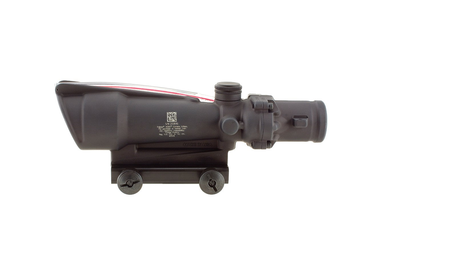 ACOG 4x32 Scope with Red Horseshoe BAC Reticle- includes Flattop Adapter. Features dual illumination (Fiber optics provides daylight illumination and tritium illuminates reticle at night). The ranging reticle is calibrated for 5.56(.223 cal) flattop rifles out to 800 meters.
